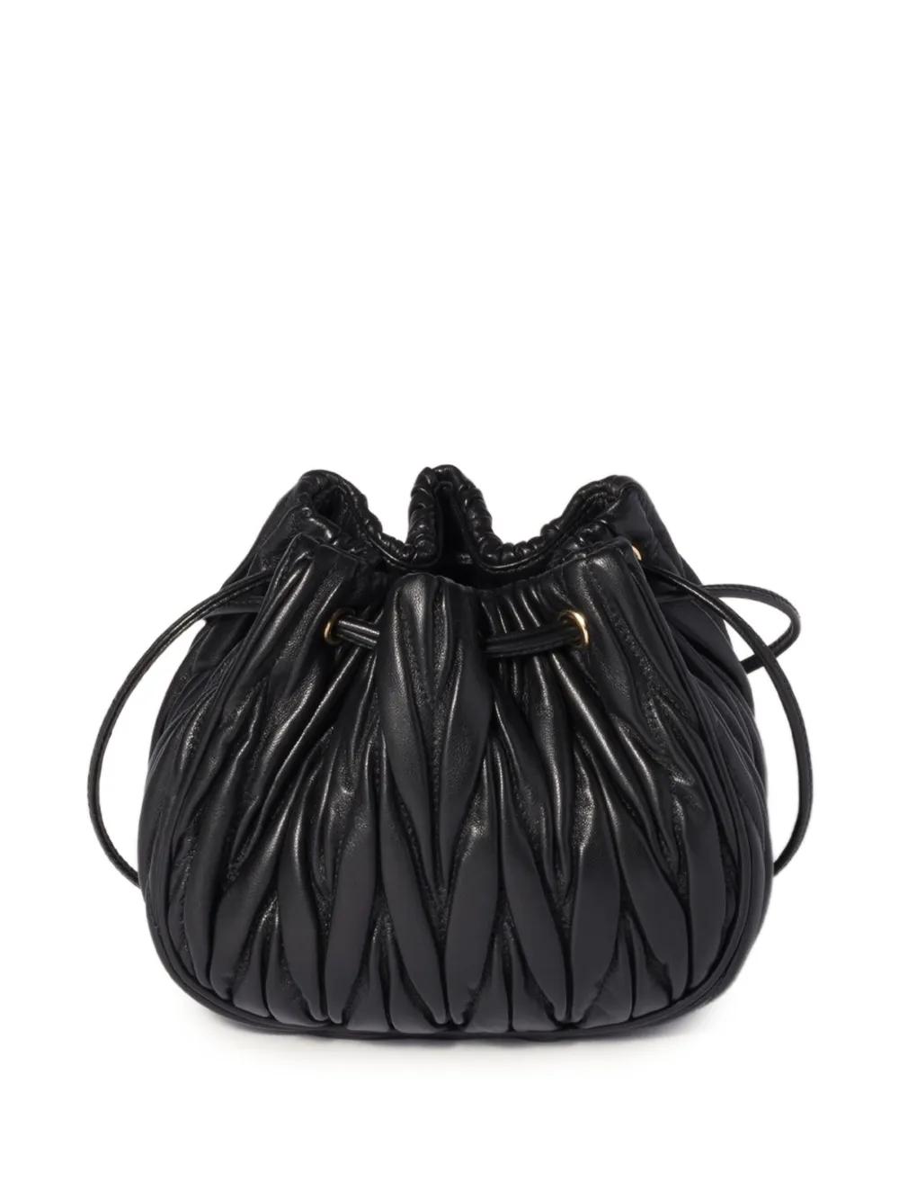 black matelassé leather drawstring closure gold-tone lettering logo lambskin leather