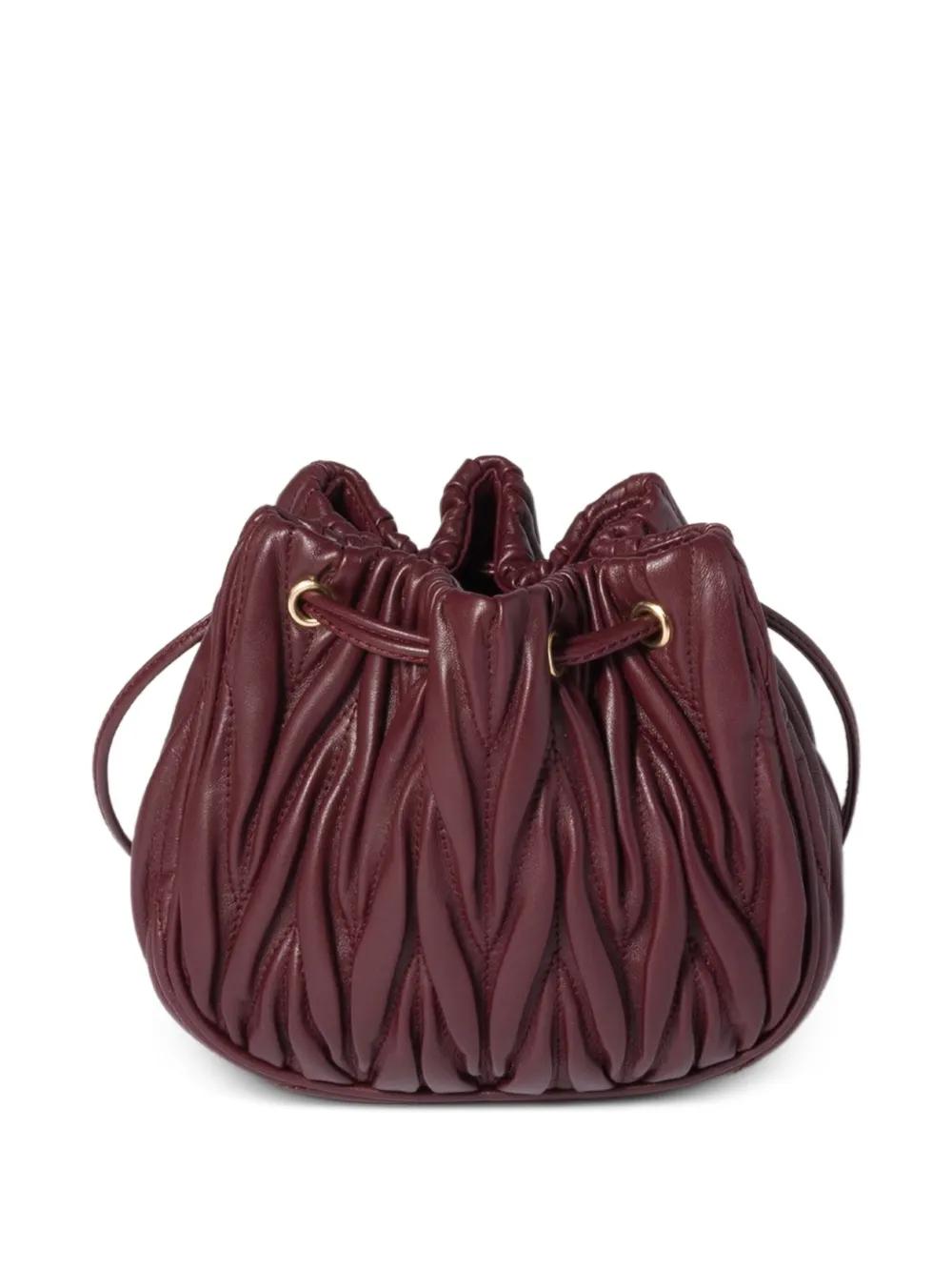 burgundy matelassé leather drawstring closure logo lettering pleated detailing