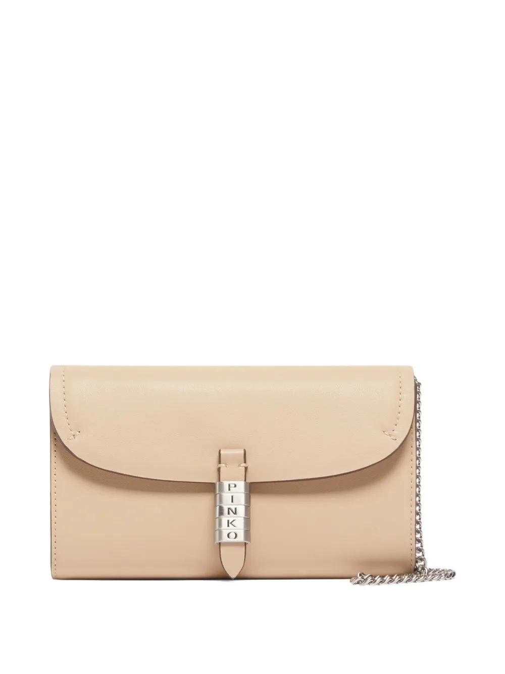 beige leather construction logo lettering detachable chain strap flap closure zip fastening