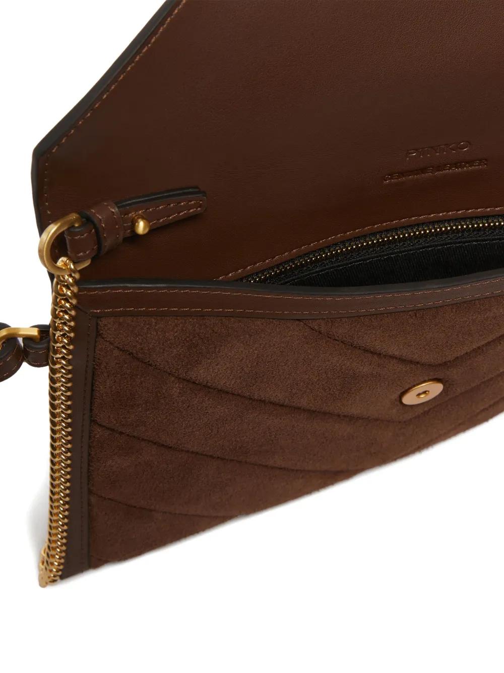 chocolate brown foldover top with magnetic fastening wrist strap chain-link shoulder strap internal zip-fastening pocket