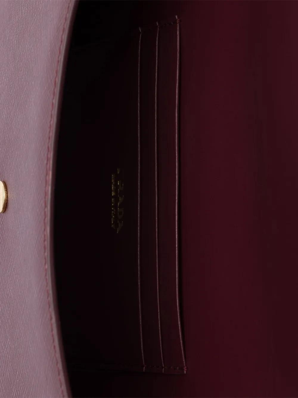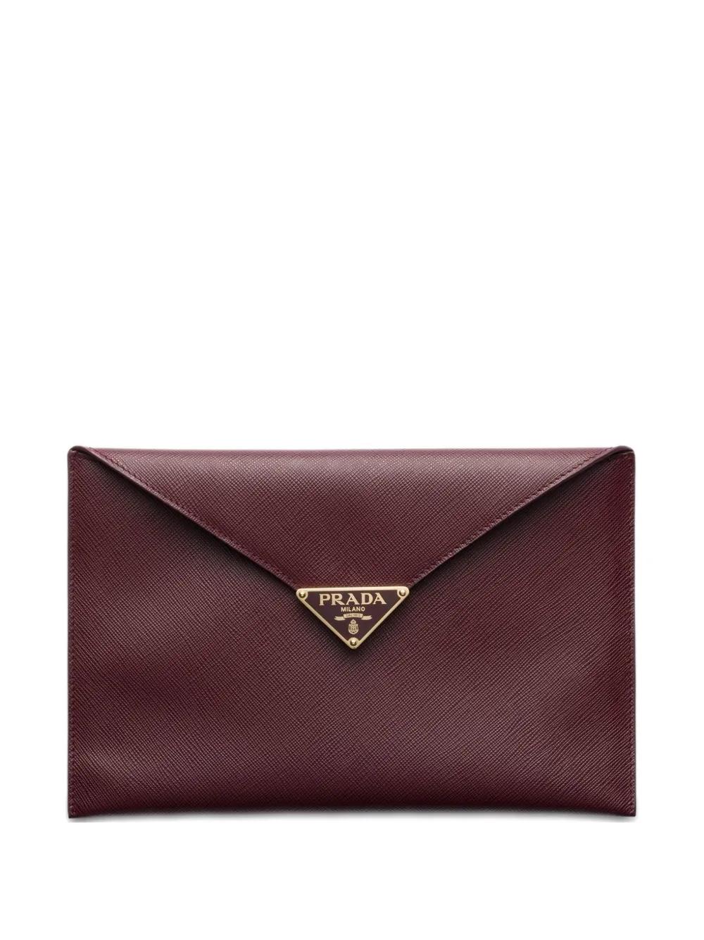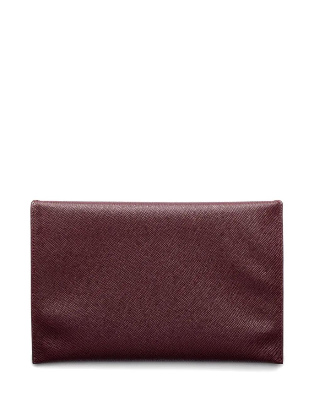 burgundy leather snap closure triangle logo three card slots envelope shape
