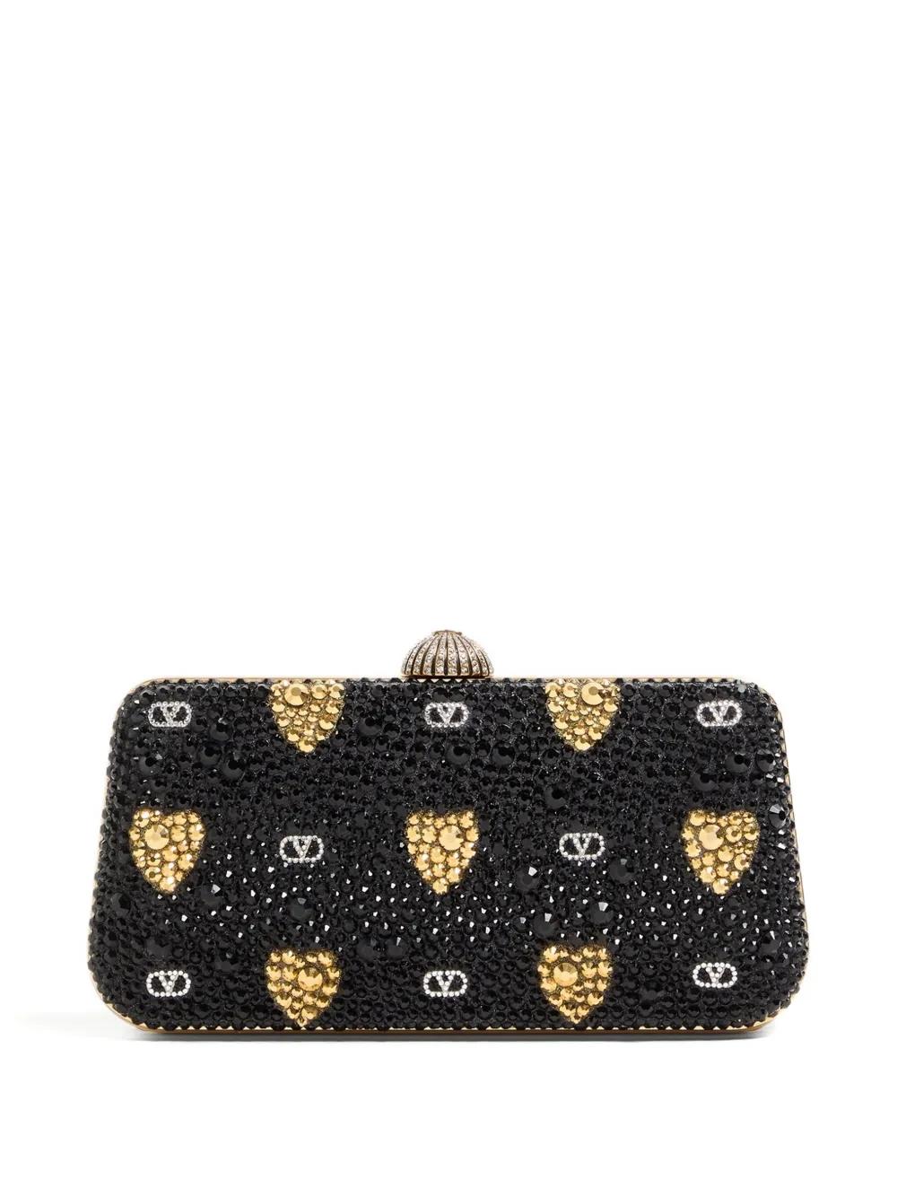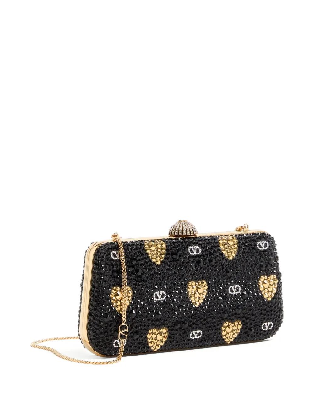 black gold-tone heart motifs chain shoulder strap snap closure logo detailing