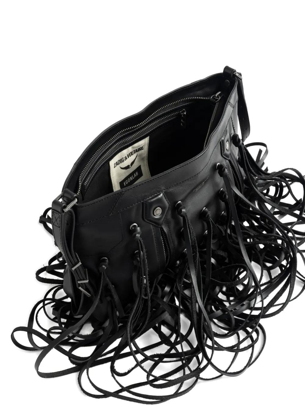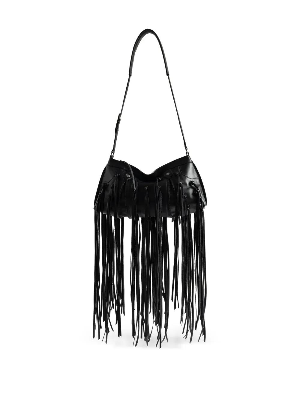 black leather fringe knotted leather straps silver-tone metal details flap closure shoulder strap