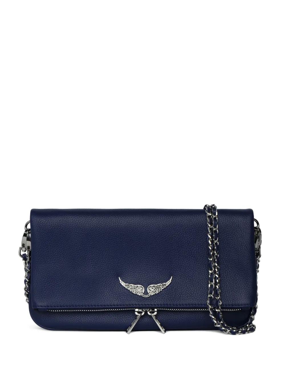 navy blue two-way zip fastening foldover top with magnetic fastening detachable chain-link shoulder strap detachable leather and chain-link shoulder strap