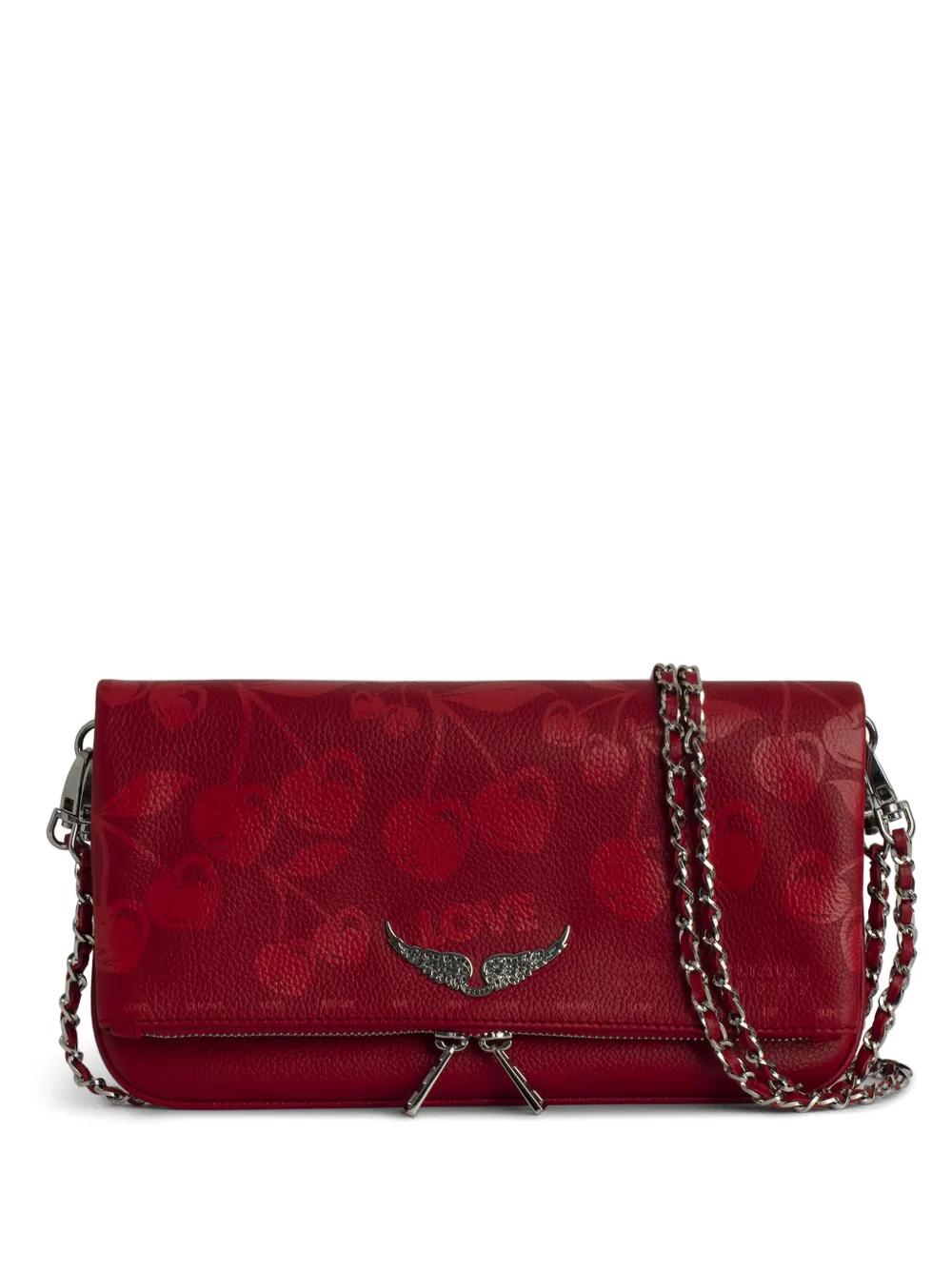 brick red foldover top with magnetic fastening top zip fastening two detachable leather and chain-link shoulder straps internal slip pocket
