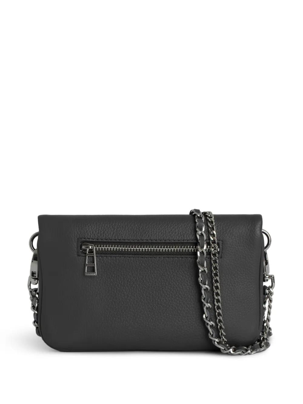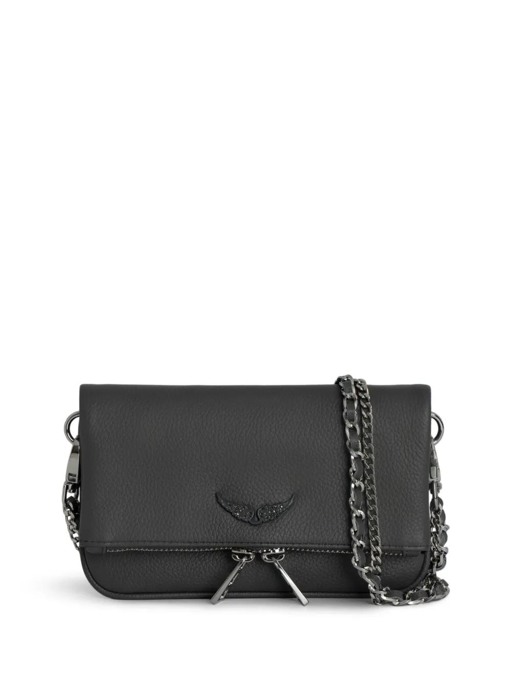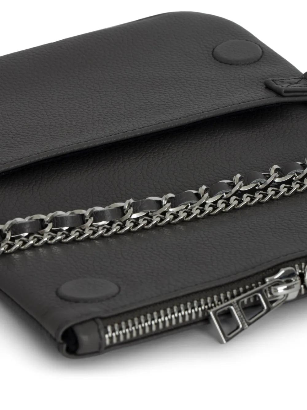 black calf leather grained texture tonal logo plaque crystal embellishment detachable leather and chain-link shoulder strap foldover top with magnetic fastening two-way zip fastening main compartment internal logo patch full lining slip pocket to the front rear zip-fastening pocket silver-tone hardware