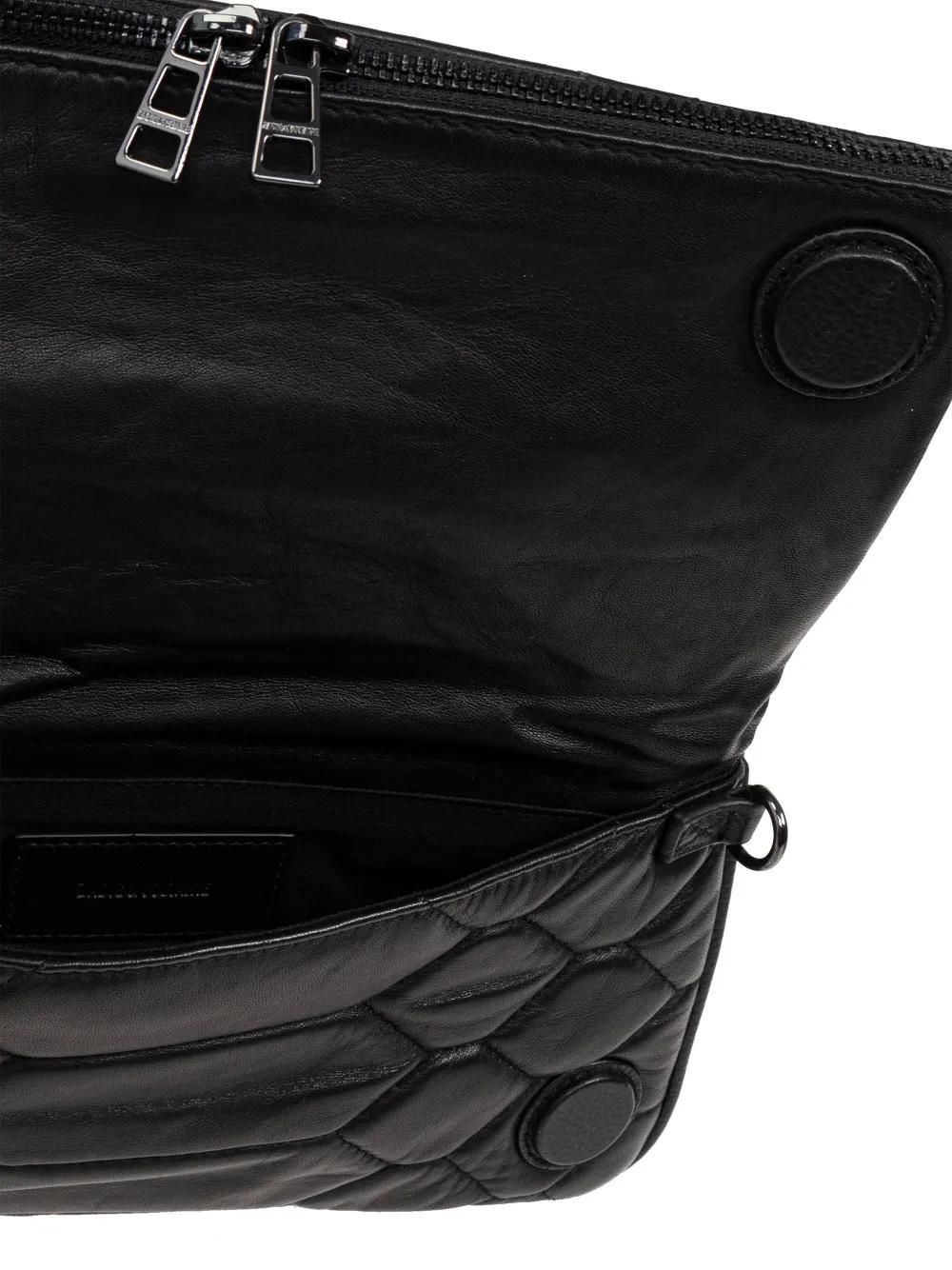 black zip fastening logo patch to the front rear zip fastening detachable chain-link shoulder strap main compartment foldover top