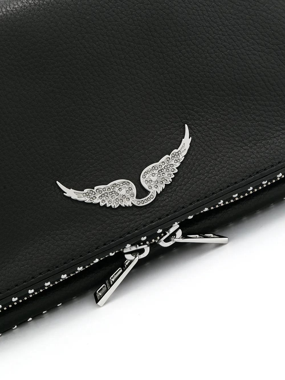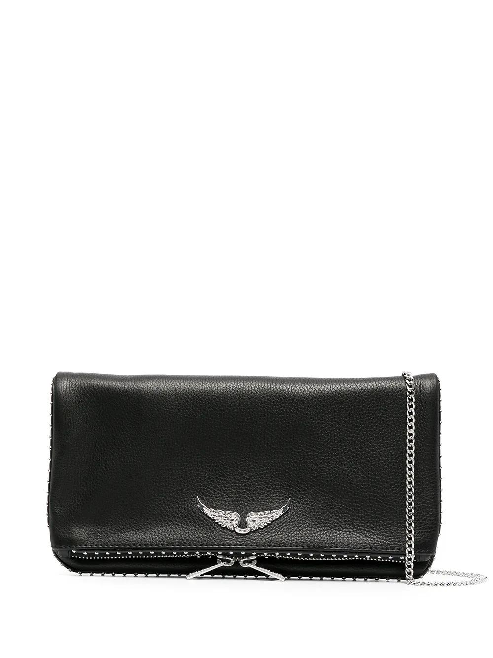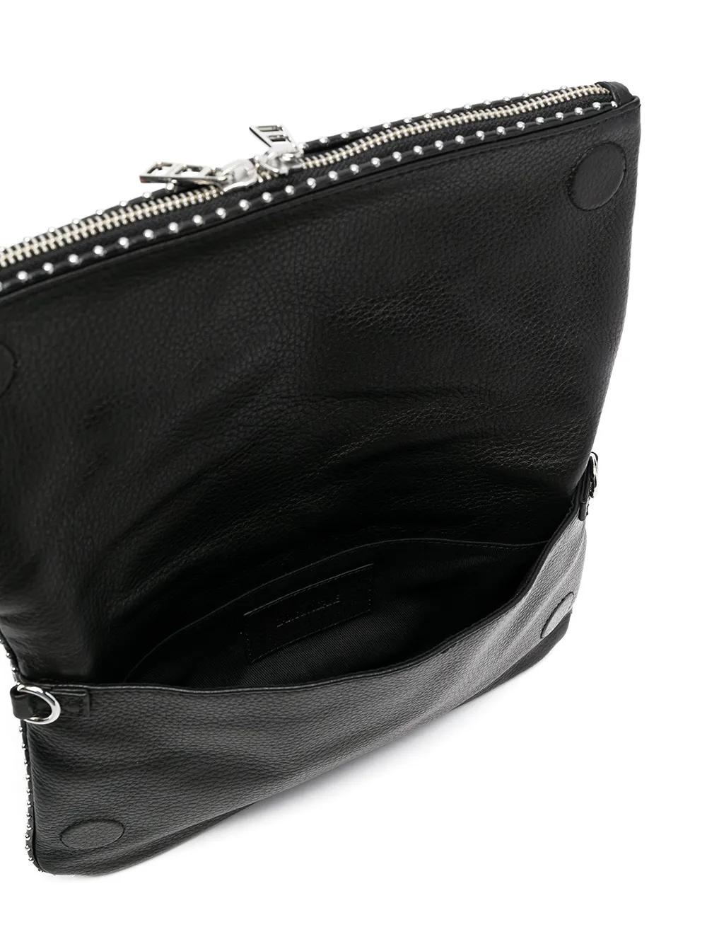Black leather studded clutch bag from Zadig & Voltaire featuring silver-tone hardware, an internal logo patch, rounded stud embellishments, a top zip fastening, a foldover top with magnetic closure and a silver-tone logo plaque.