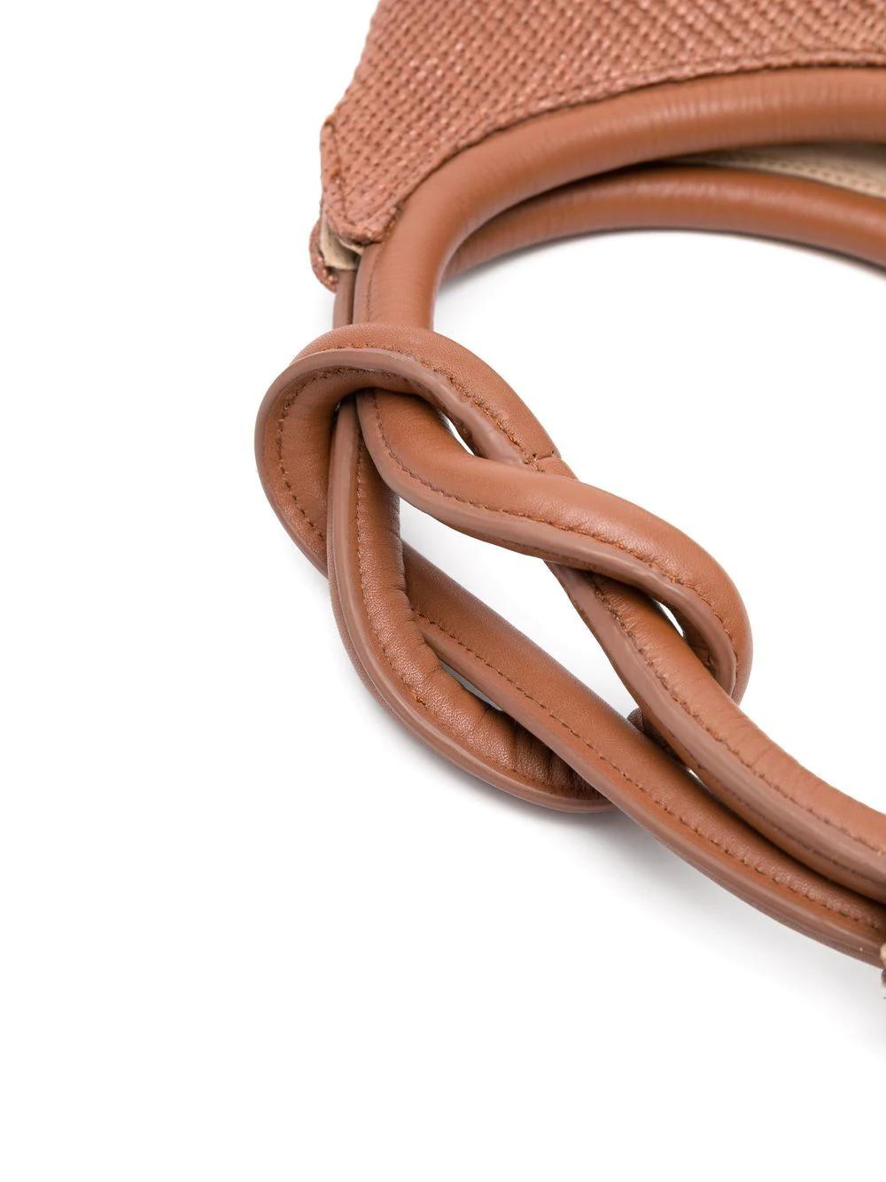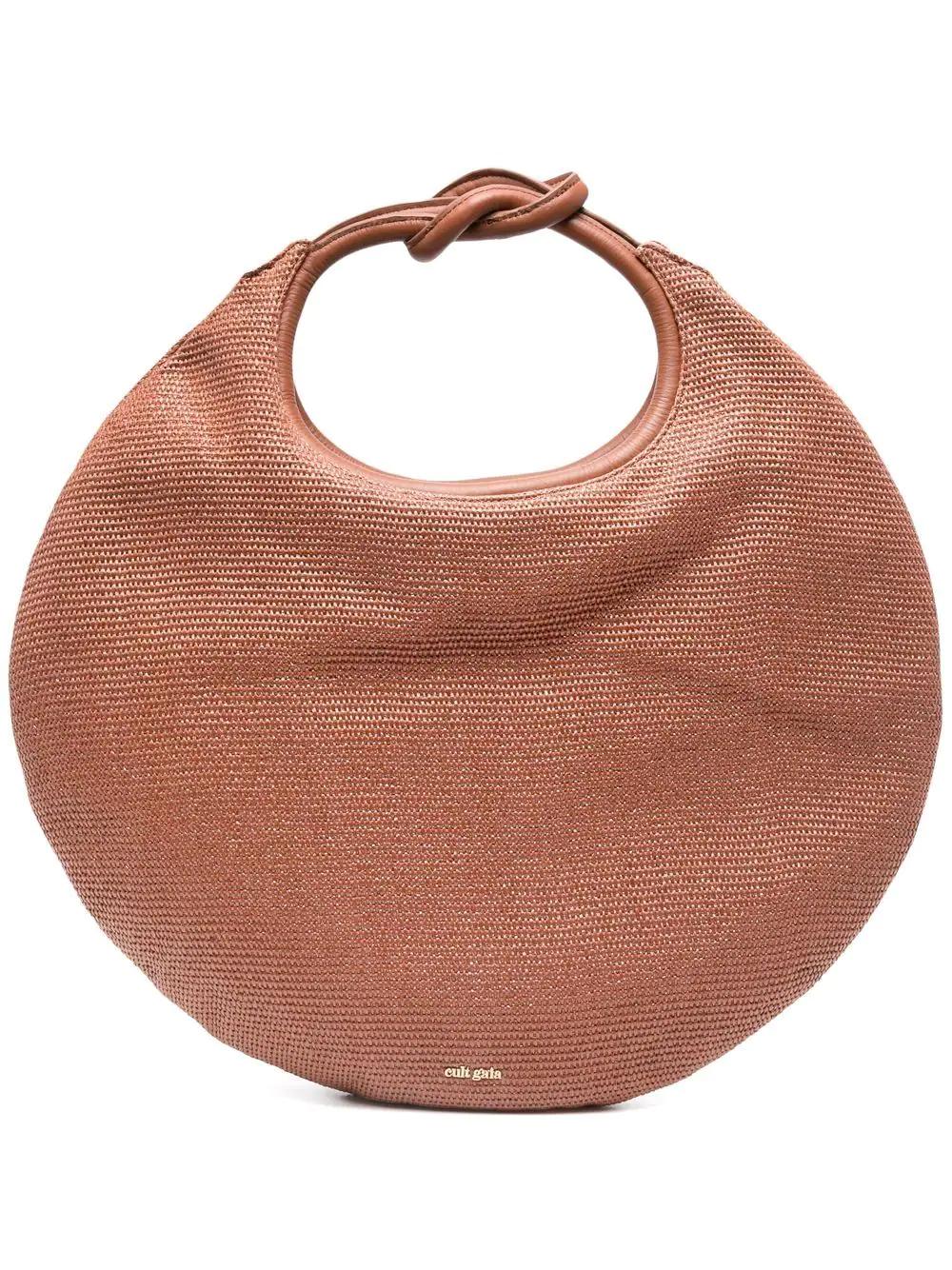 Adina raffia shoulder bag from CULT GAIA featuring auburn brown, raffia, leather trim, gold-tone logo lettering, single rounded top handle, knot detailing and main compartment.