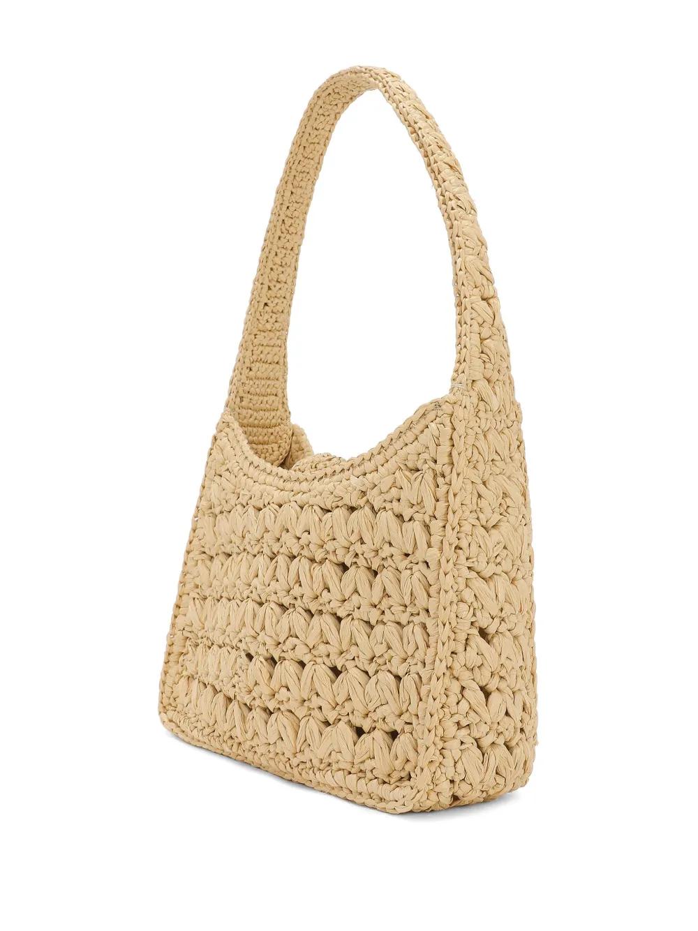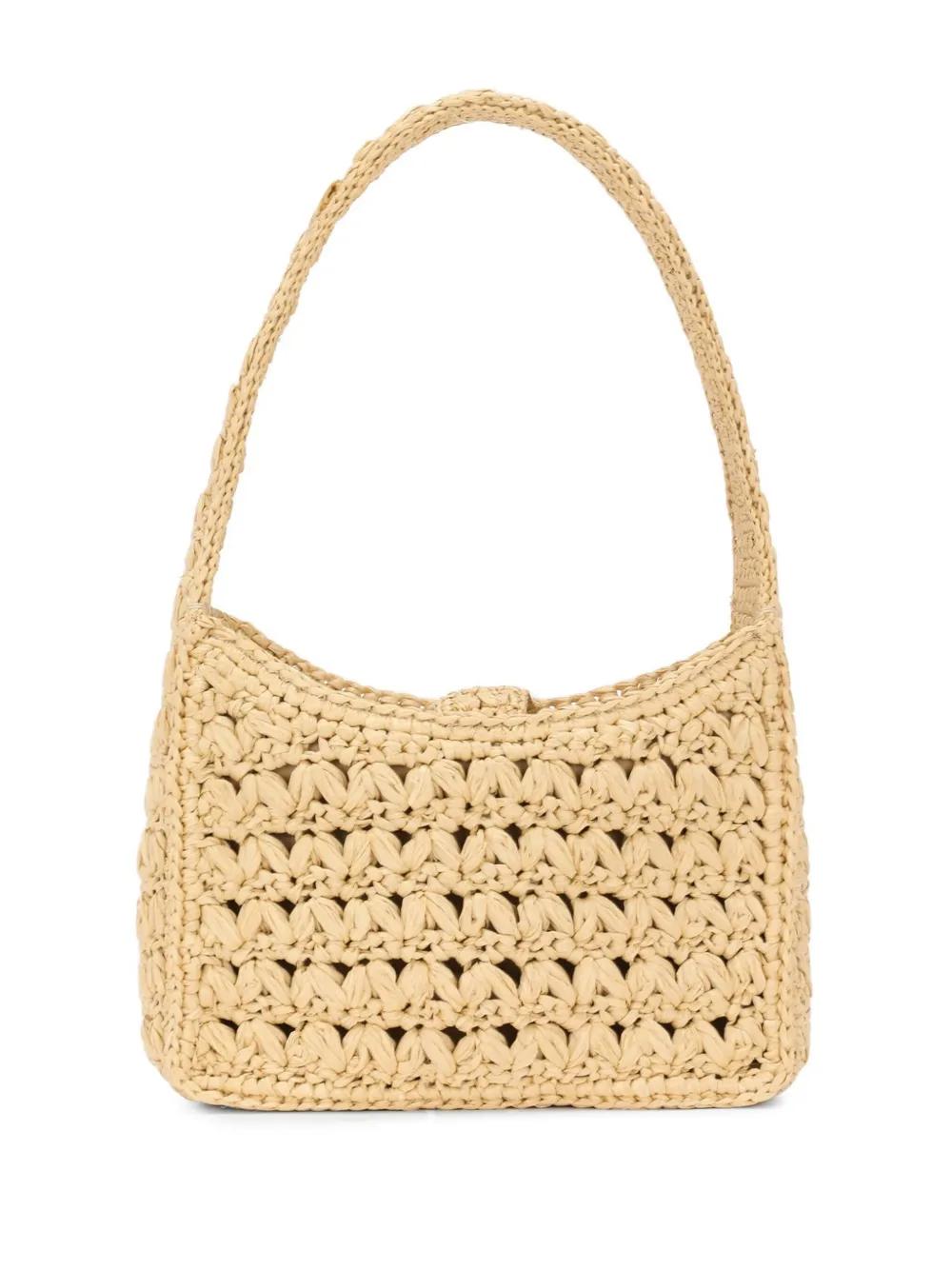 beige raffia crochet knit appliqué logo gold-tone hardware single shoulder strap magnetic fastening main compartment internal zip-fastening pocket full lining