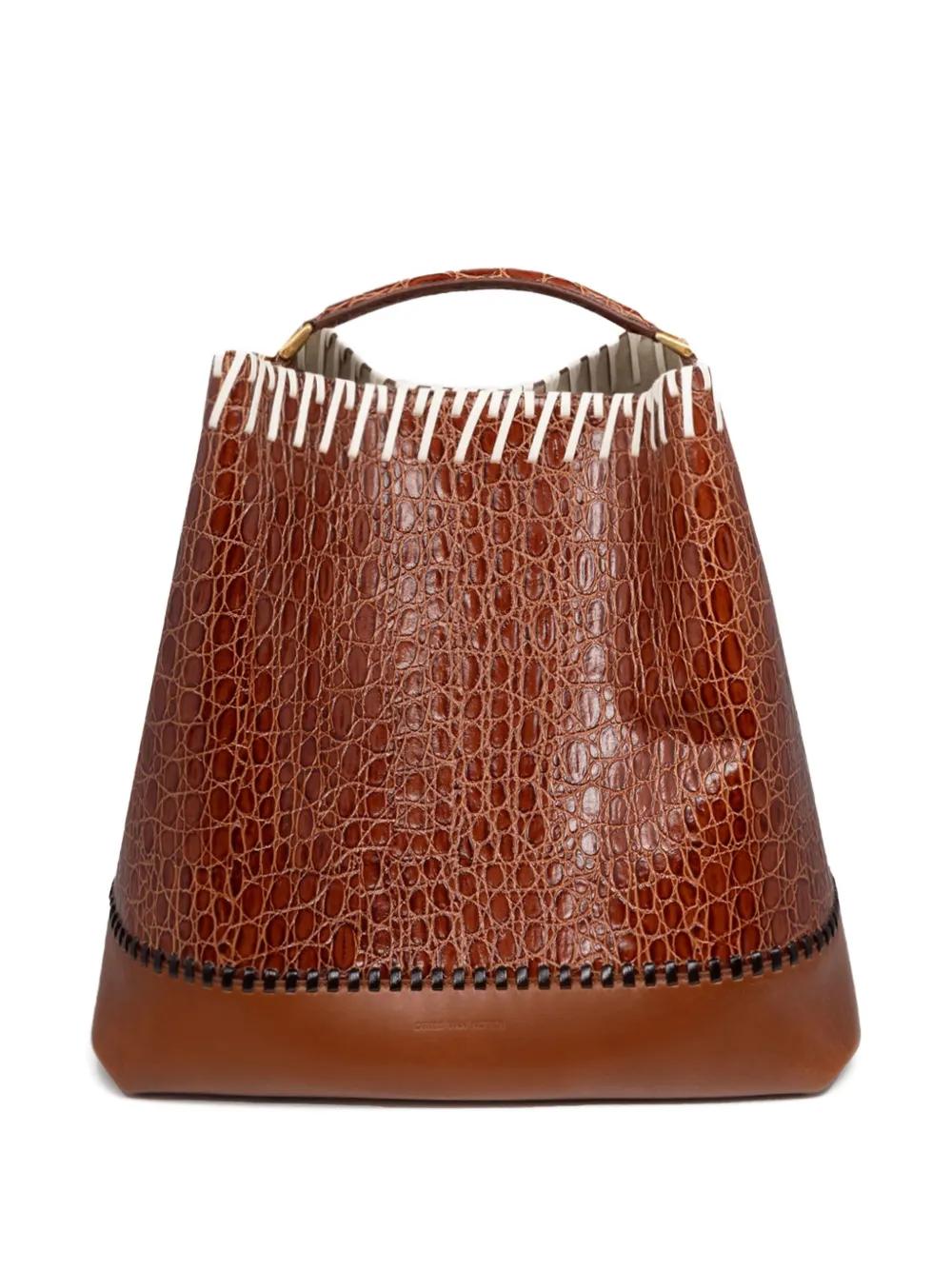 brown embossed leather top handle adjustable shoulder strap contrast stitched trim