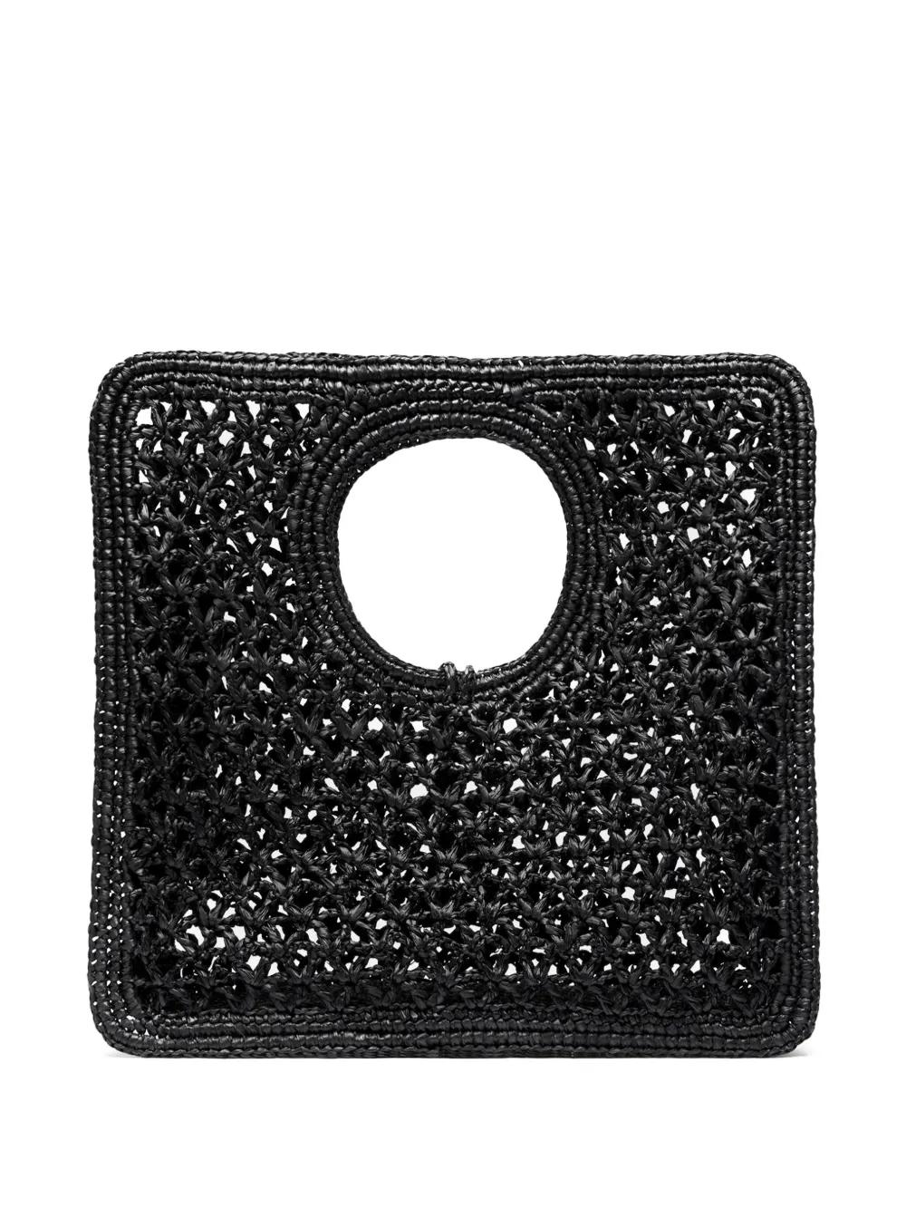 black strap fastening cut-out top handle charm detail braided edge
