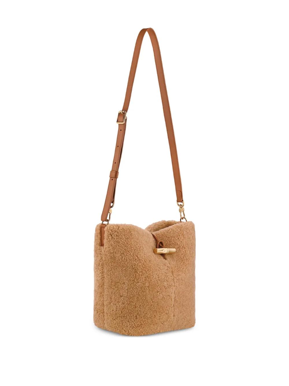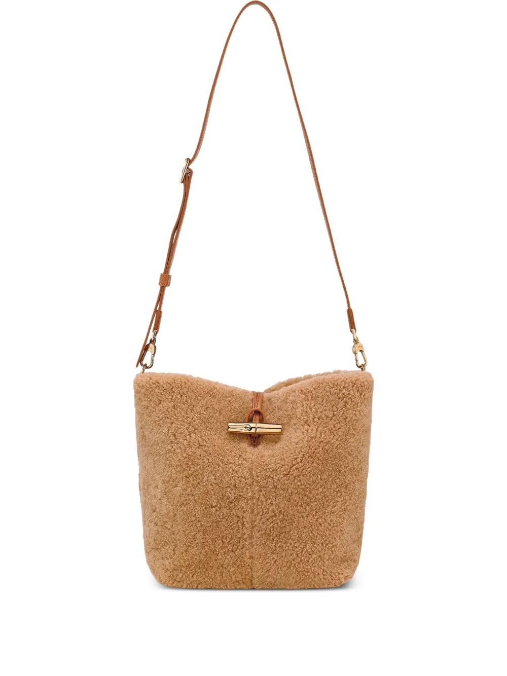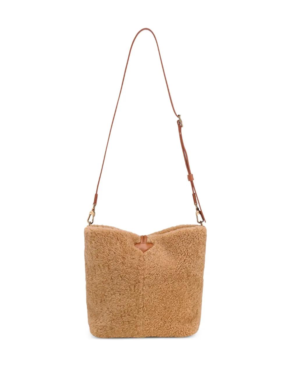 camel shearling texture adjustable shoulder strap gold-tone hardware bamboo toggle closure