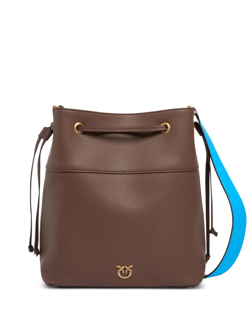 brown leather drawstring closure gold-tone hardware logo plaque adjustable shoulder strap