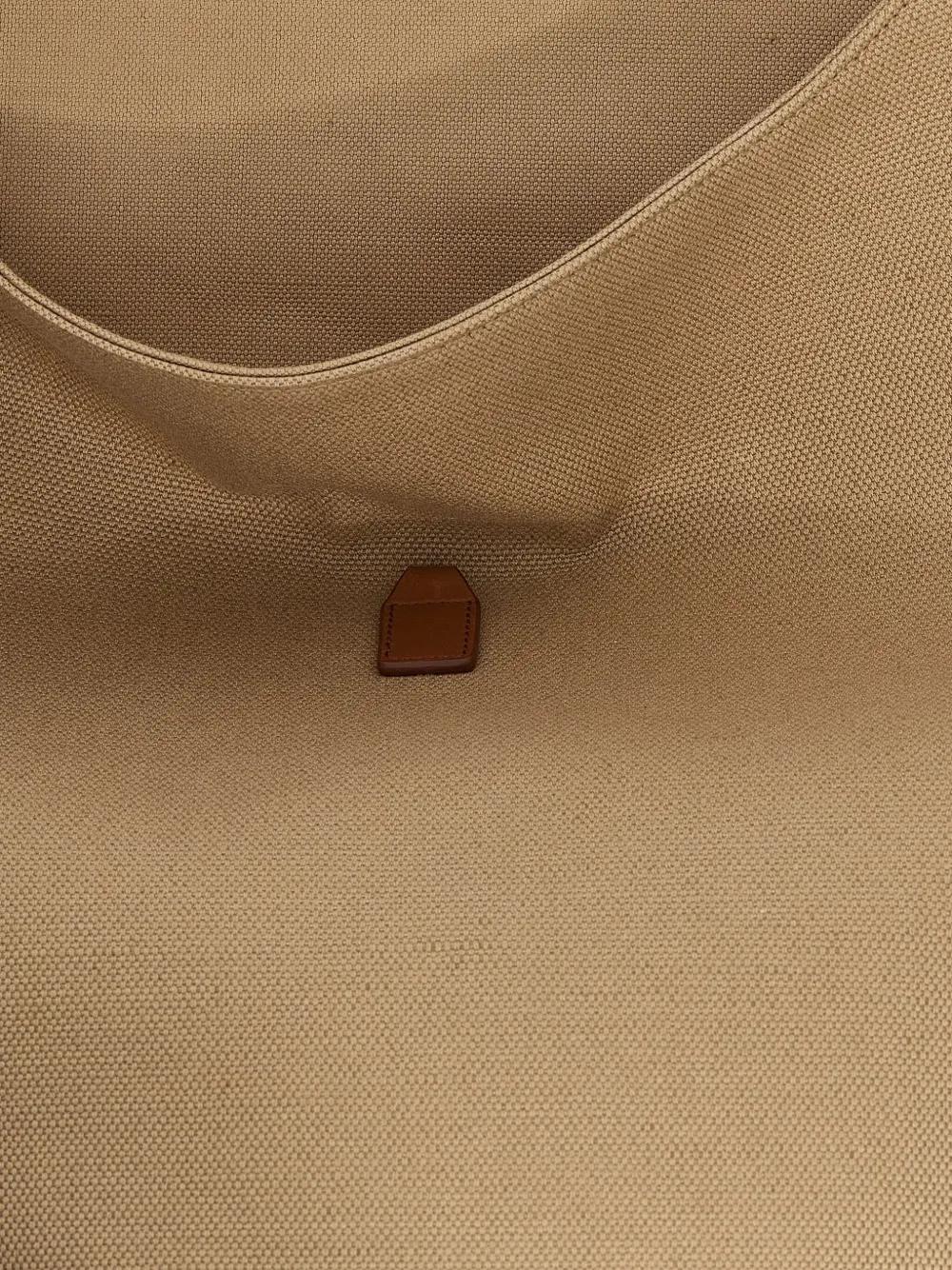 beige leather details adjustable handle metallic interlocking logo bucket style cotton and linen