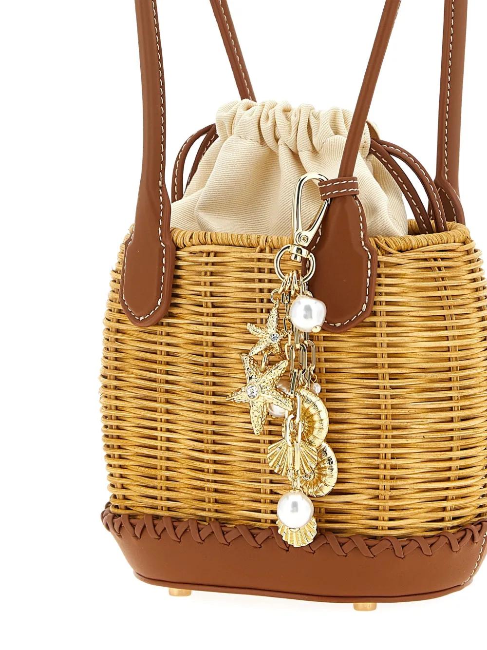 light brown drawstring closure two top handles embellishment charm decorative stitching at base metal feet