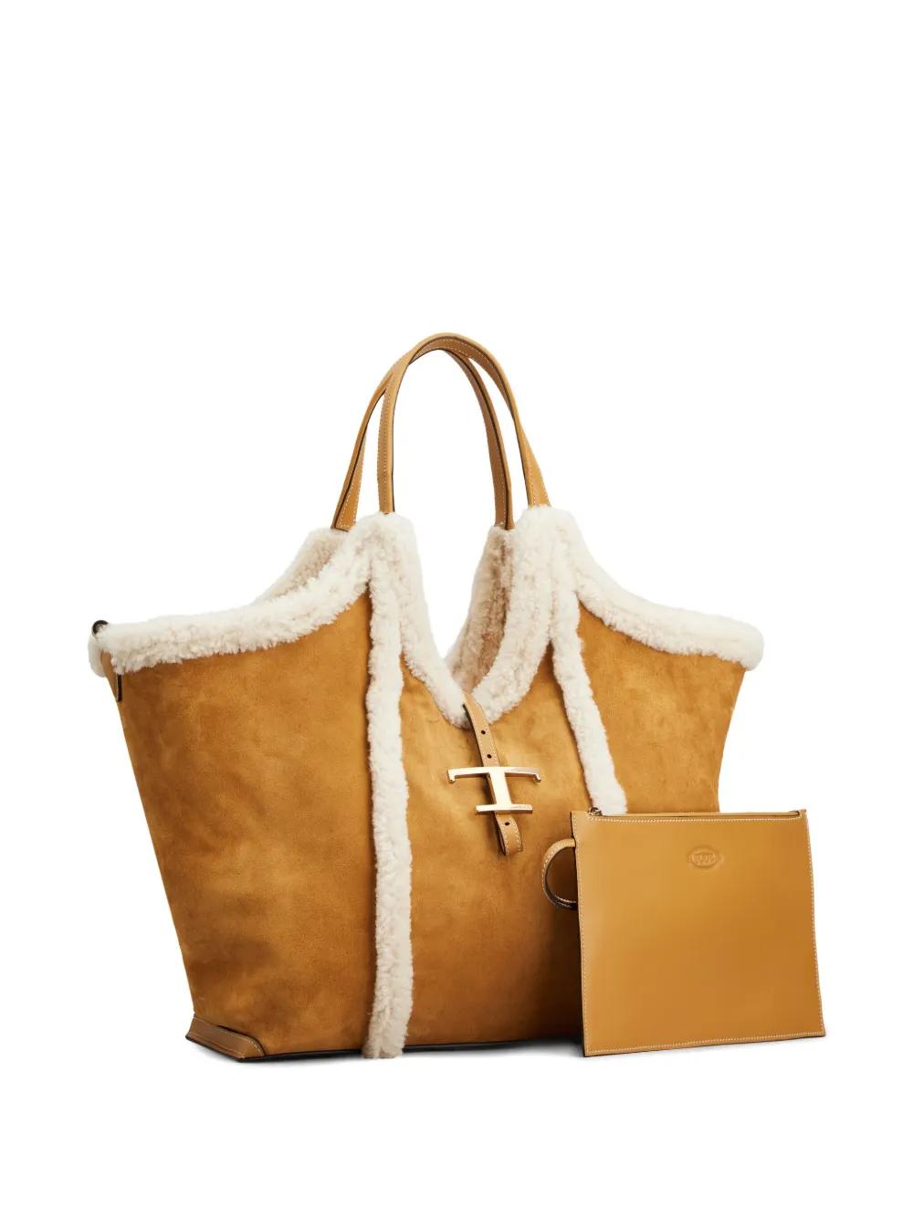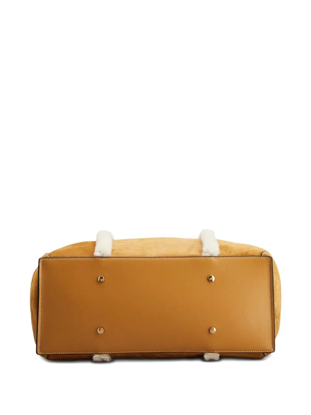 brown suede texture shearling trim T-buckle fastening leather top handles internal zip pocket