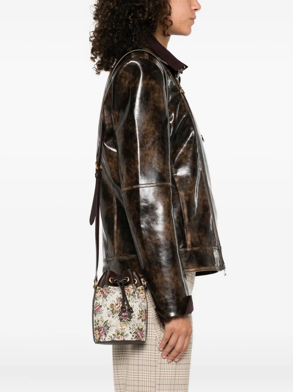 beige floral tapestry drawstring closure leather trim gold-tone logo leather shoulder strap