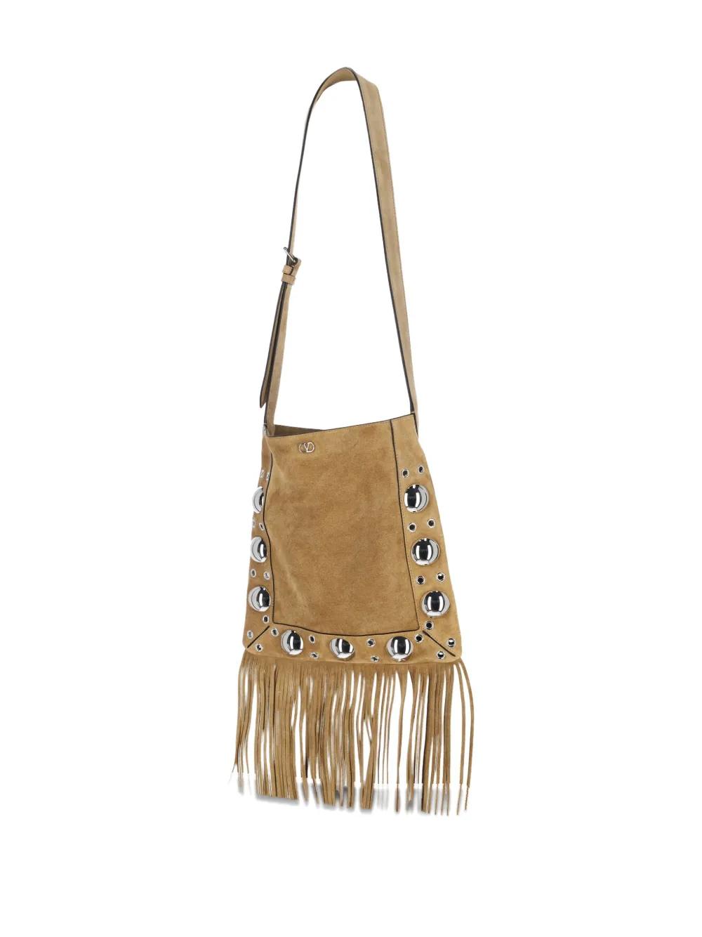 light brown suede fringed trim eyelet detailing adjustable shoulder strap logo detailing