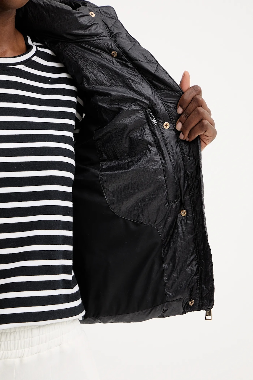 - Hydrofobowe wykończenie materiału wierzchniego nie pozwala dostać się wilgoci do wewnątrz, dzięki czemu dobrze chroni przed niekorzystnymi warunkami atmosferycznymi. - Prosty fason. - Zapięcie na suwak i zatrzaski. - Odpinany kaptur. - Dwie wsuwane i zapinane na zatrzask kieszenie boczne. - Kieszeń wewnętrzna zapinana na suwak pozwala na bezpieczne przechowywanie drobiazgów. - Ocieplony model na podszewce. - Długość: 50 cm. - Szerokość pod pachami: 52 cm. - Wymiary podane dla rozmiaru: S.