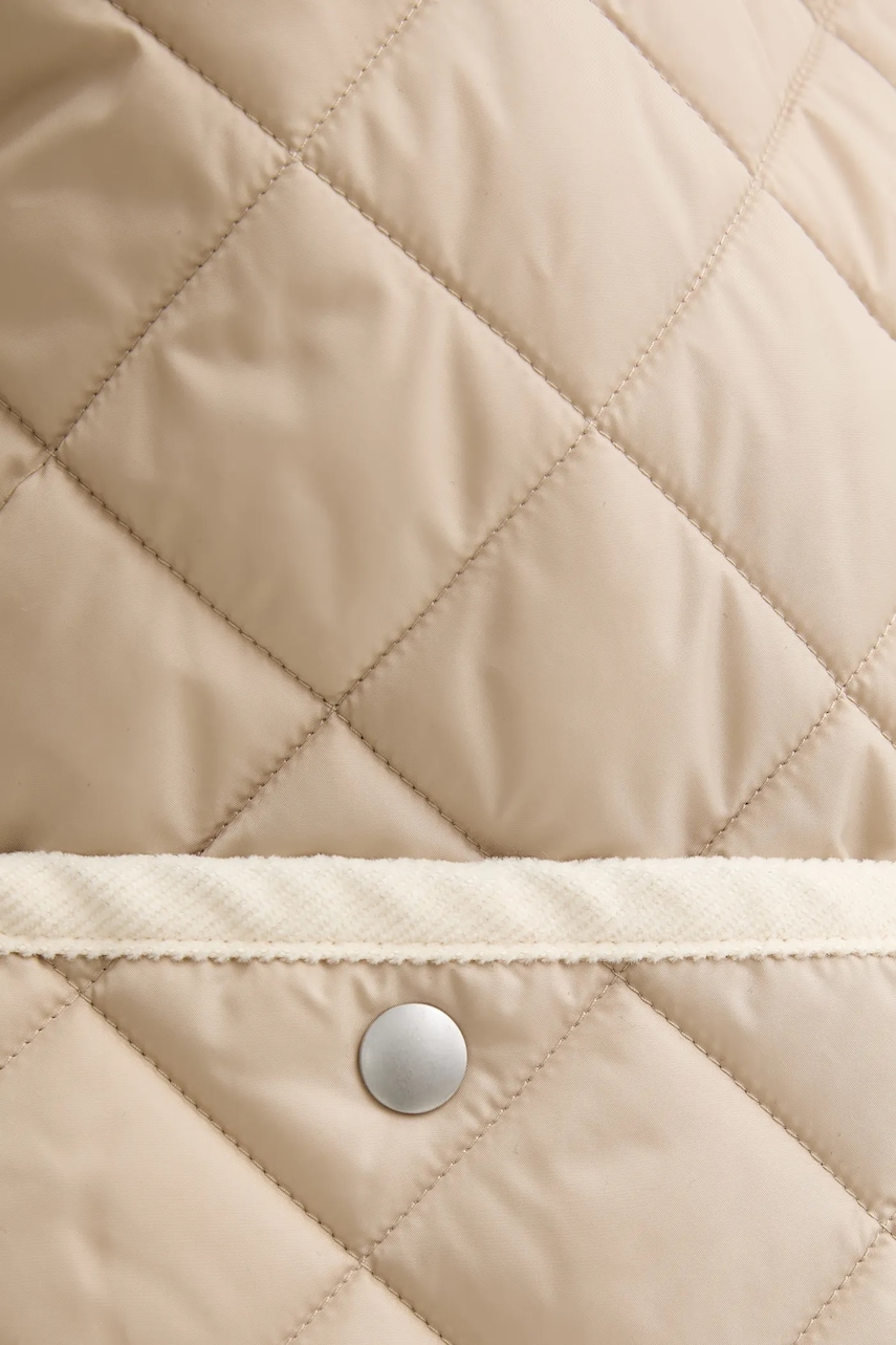 - Produkty z certyfikatem Recycled Claim Standard (RCS) zawierają materiał z recyklingu, który jest poddawany niezależnej weryfikacji na każdym etapie łańcucha dostaw. - Model częściowo wykonany z włókna REPREVE. - Włókno REPREVE wykonane jest ze zutylizowanych plastikowych butelek. - Pikowany model. - Prosty fason. - Z przodu kieszonki. - Zapięcie na zatrzaski. - Długość: 55 cm. - Szerokość pod pachami: 52 cm. - Wymiary podane dla rozmiaru: 36.