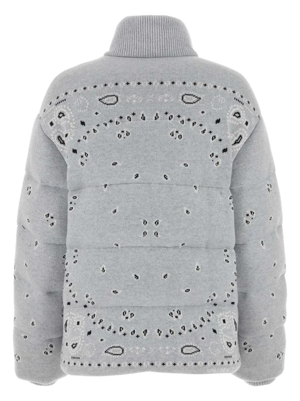 medium grey virgin wool feather down bandana print high neck front zip fastening long sleeves ribbed cuffs two side inset pockets straight hem