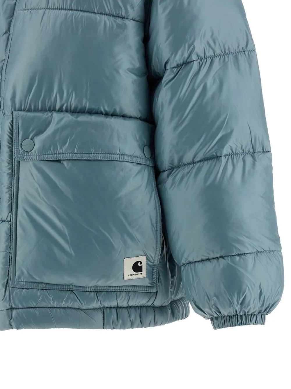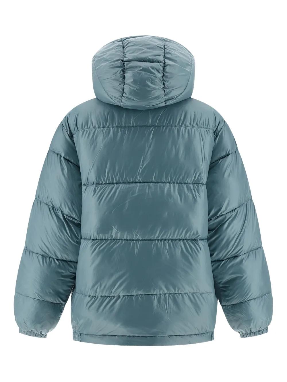 light blue padded design logo patch adjustable removable hood elastic cuffs and hem