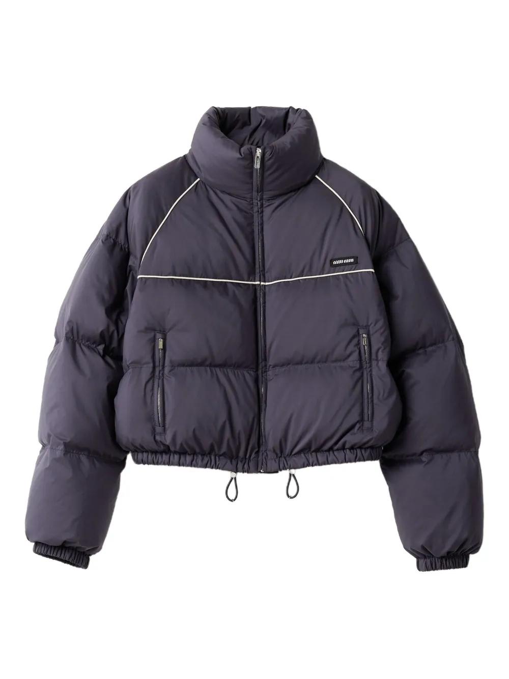 dark blue goose down padding stand-up collar raglan sleeves elasticised cuffs zip fastening zip pockets elasticised drawstring hem