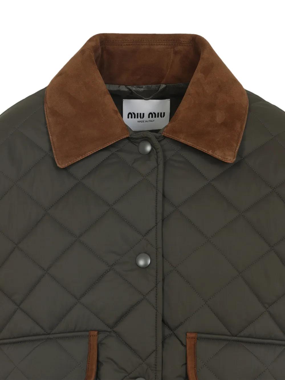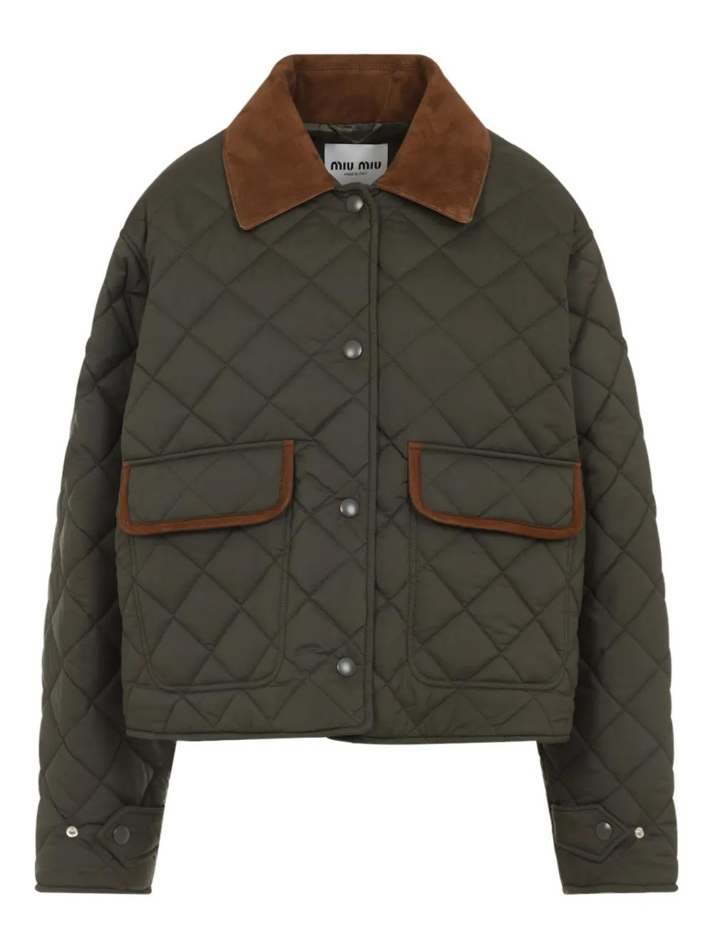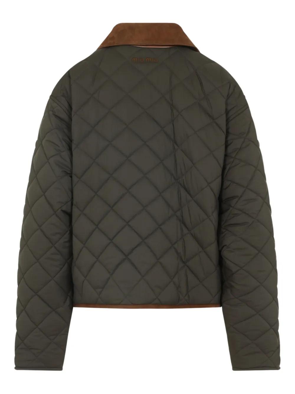 green diamond quilting suede collar front flap pockets suede trim press-stud fastening