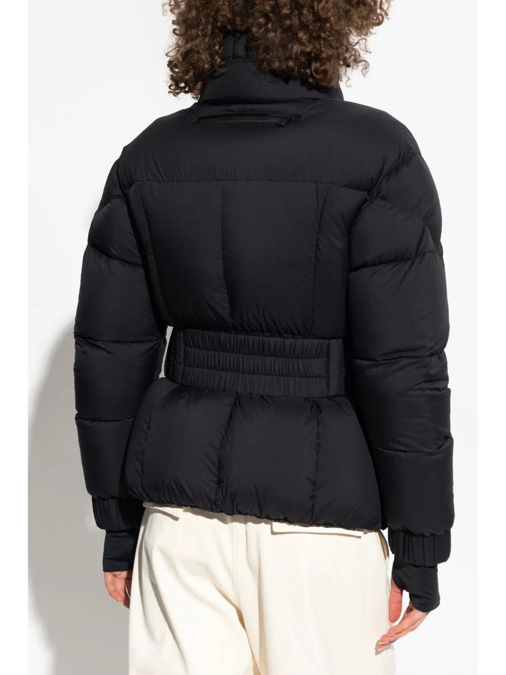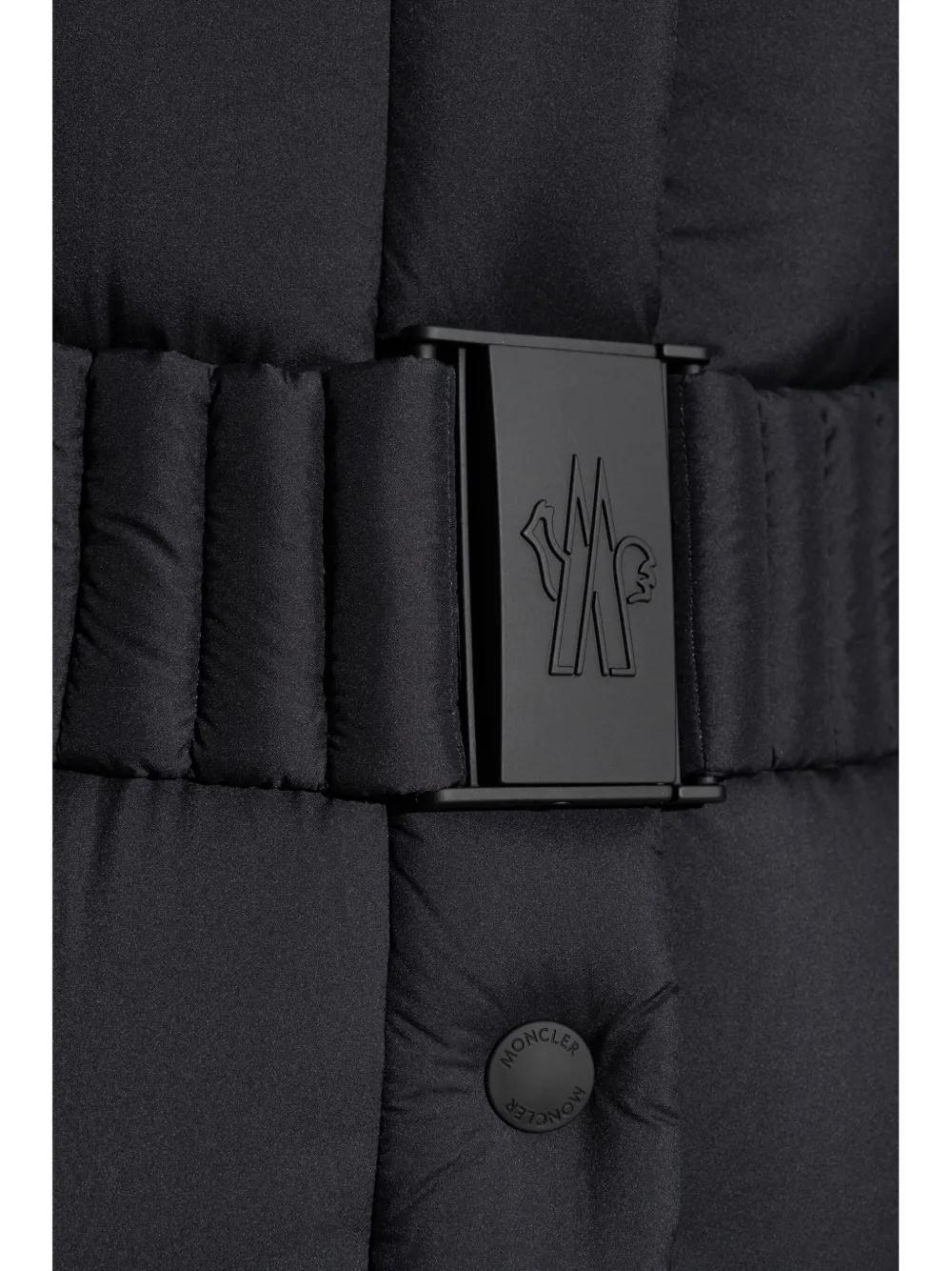 black down-feather filling water-repellent windproof insulated design front press-stud and zip fastening stand-up collar concealed hood long sleeves appliqué logo detachable belt two side zip-fastening pockets elasticated hem