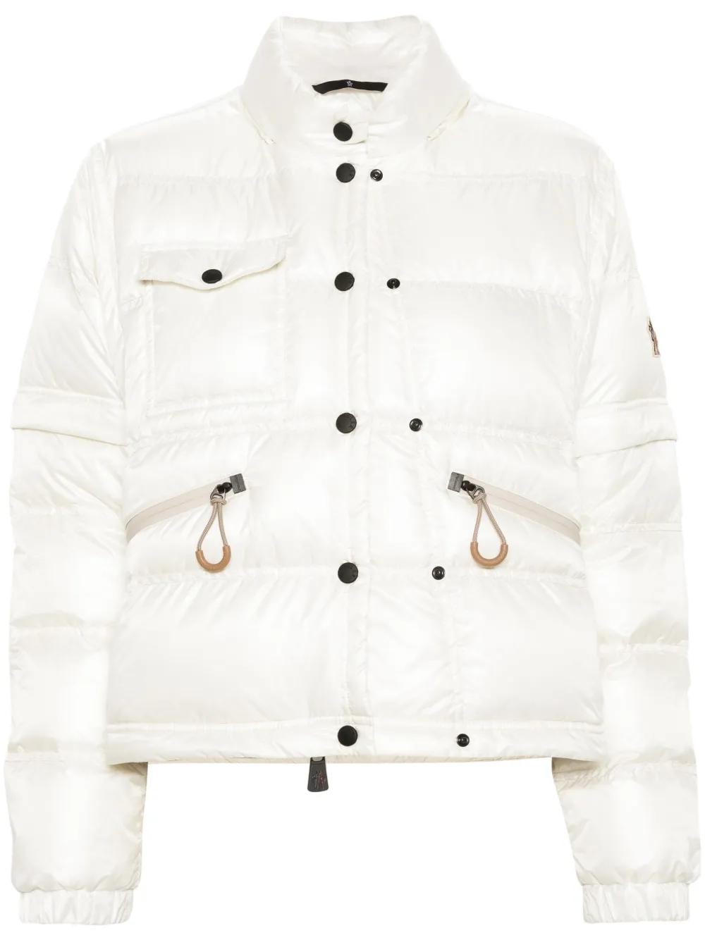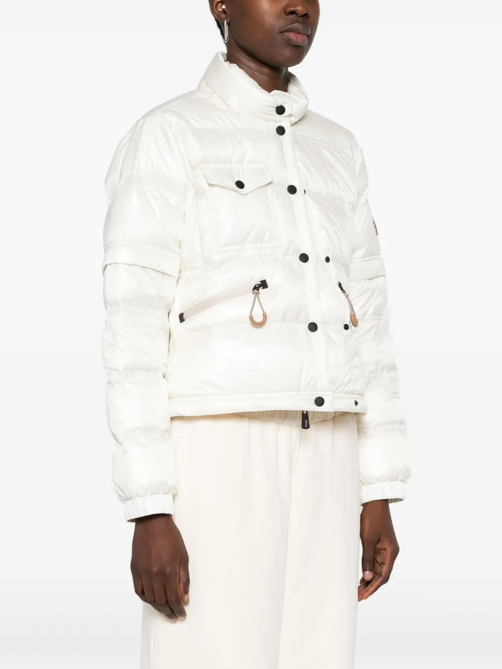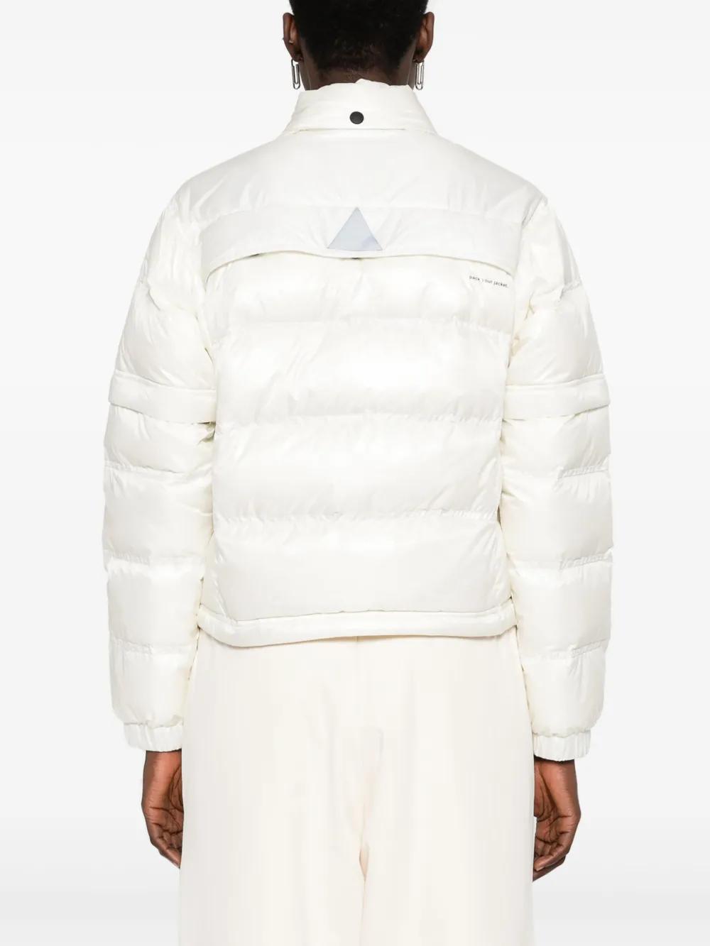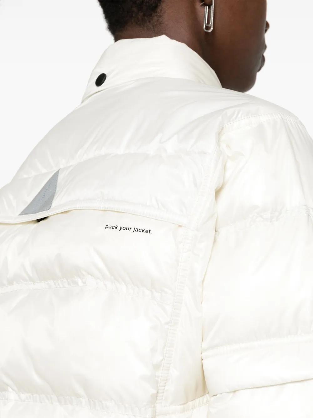 cream white goose down ripstop texture water-repellent padded design high neck with concealed hood long sleeves with elasticated cuffs and appliqué logo detachable sleeves chest flap pocket two side zip-fastening pockets rear reflective detailing internal drawstring fastening waist concealed front zip and press-stud fastening