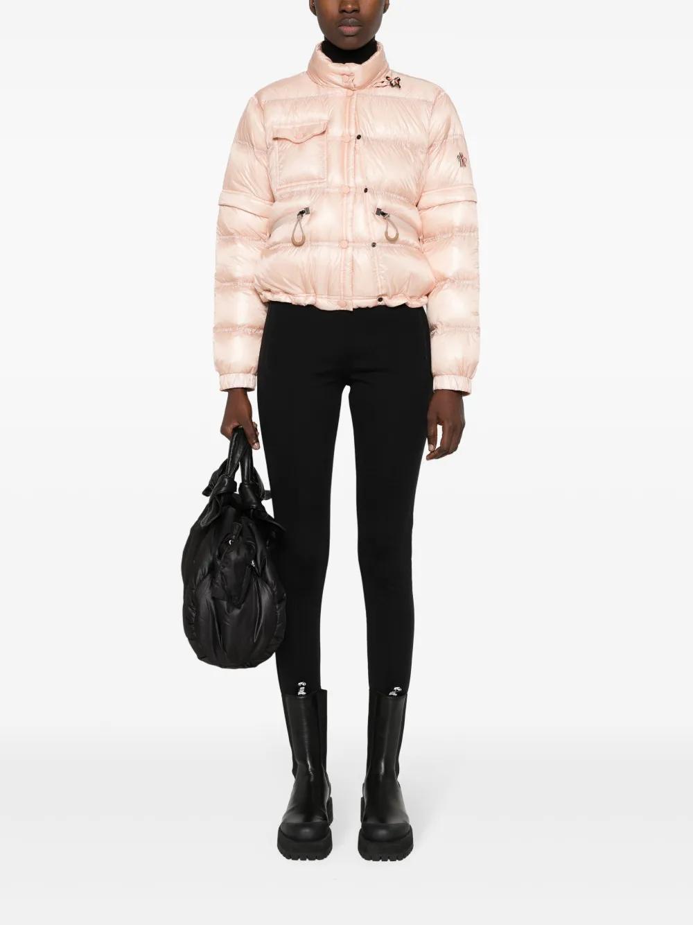 blush pink down-feather filling ripstop texture padded design quilted taped seams stand-up collar detachable sleeves with elasticated cuffs logo patch at the sleeve chest flap pocket front zip fastening pockets internal drawstring fastening waist contrast lining front press-stud and zip fastening