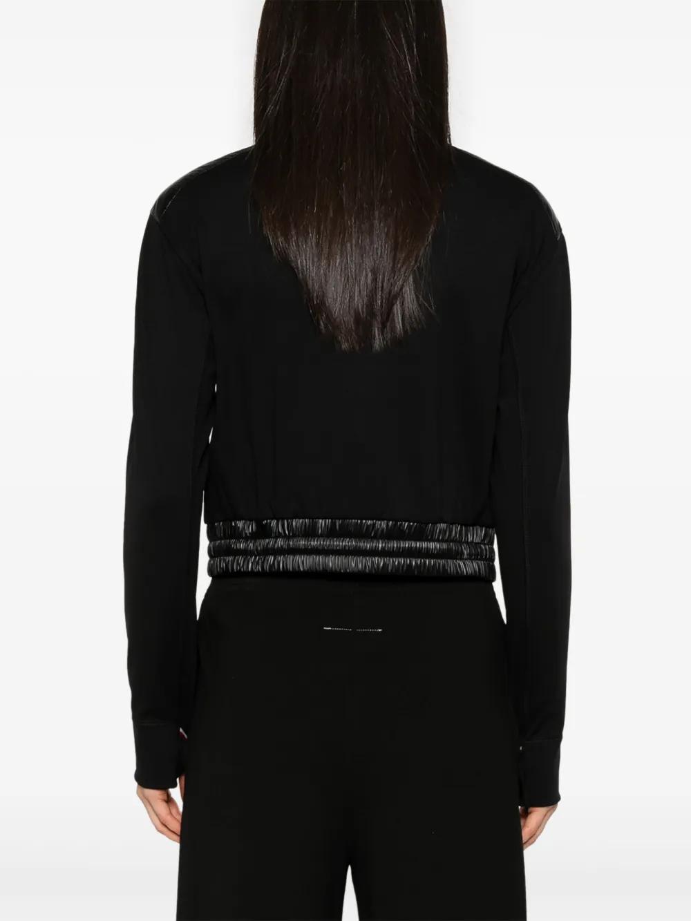 black front zip fastening thumb slots two side zip-fastening pockets elasticated drawstring waistband