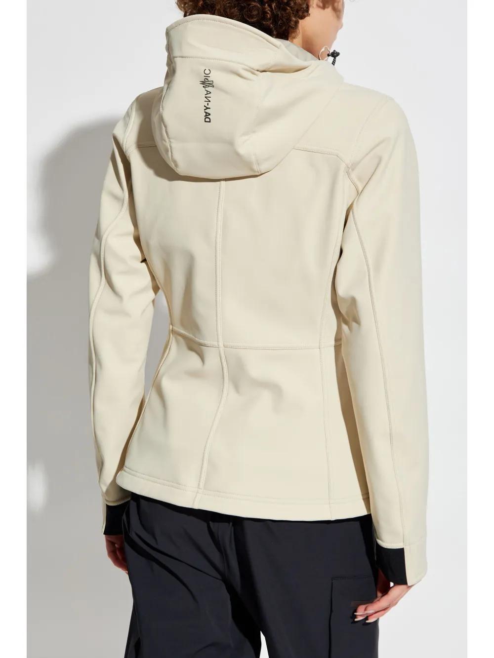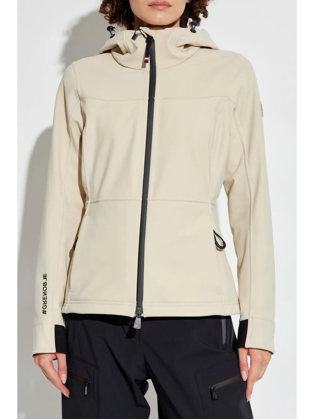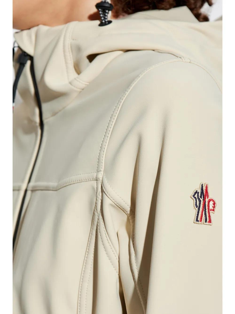 light beige scuba jersey waterproof windproof seam detailing logo print at the hood logo patch at the sleeve drawstring hood funnel neck front two-way zip fastening long sleeves elasticated cuffs two side zip-fastening pockets straight hem