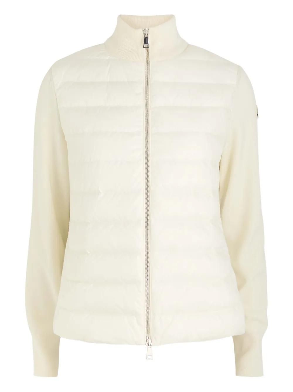 beige ribbed knit padded front front zip closure long sleeves logo patch