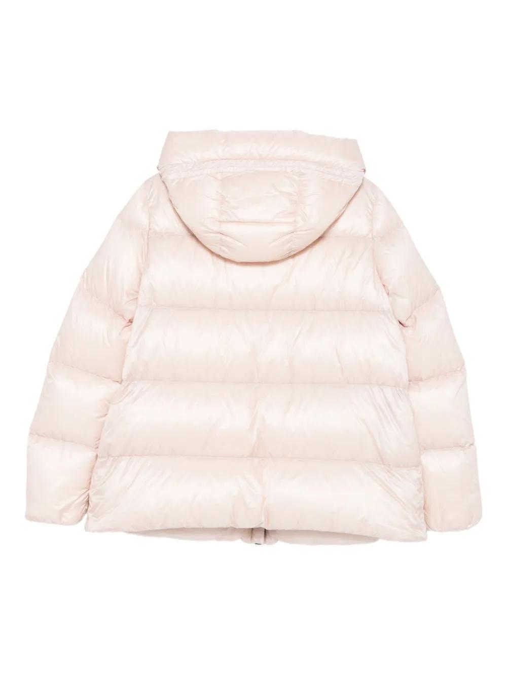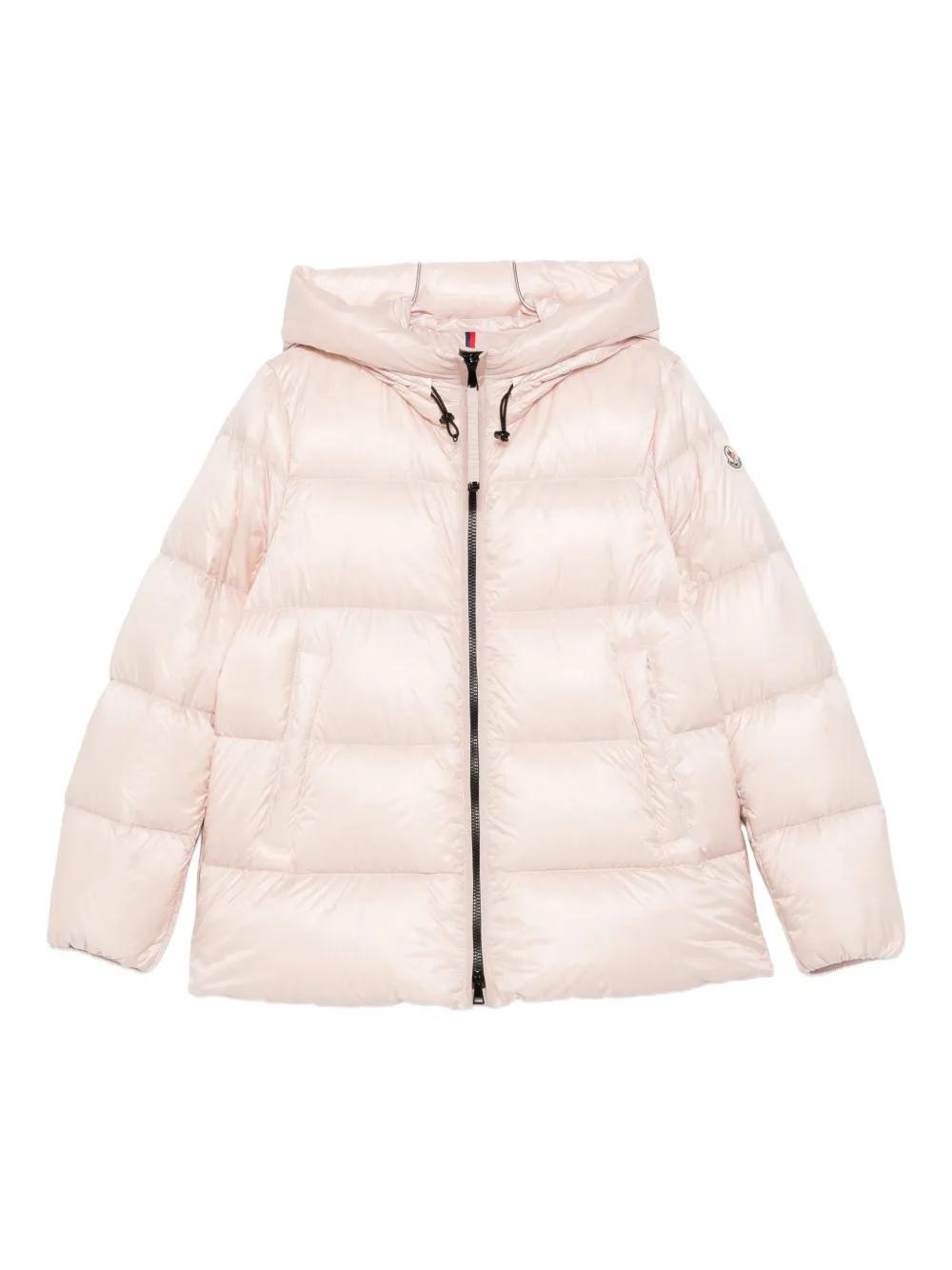 light pink quilted design hooded neckline zip fastening long sleeves straight hem