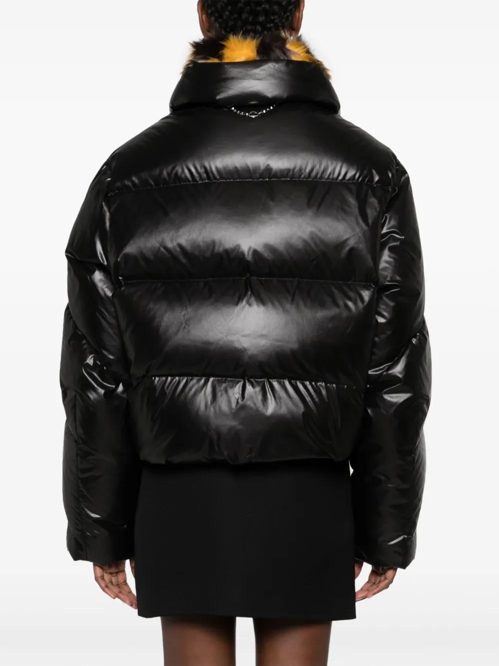 black/yellow/white cotton blend padded design quilted cropped leopard print down-feather filling faux-fur collar long sleeves press-stud fastening two side slit pockets