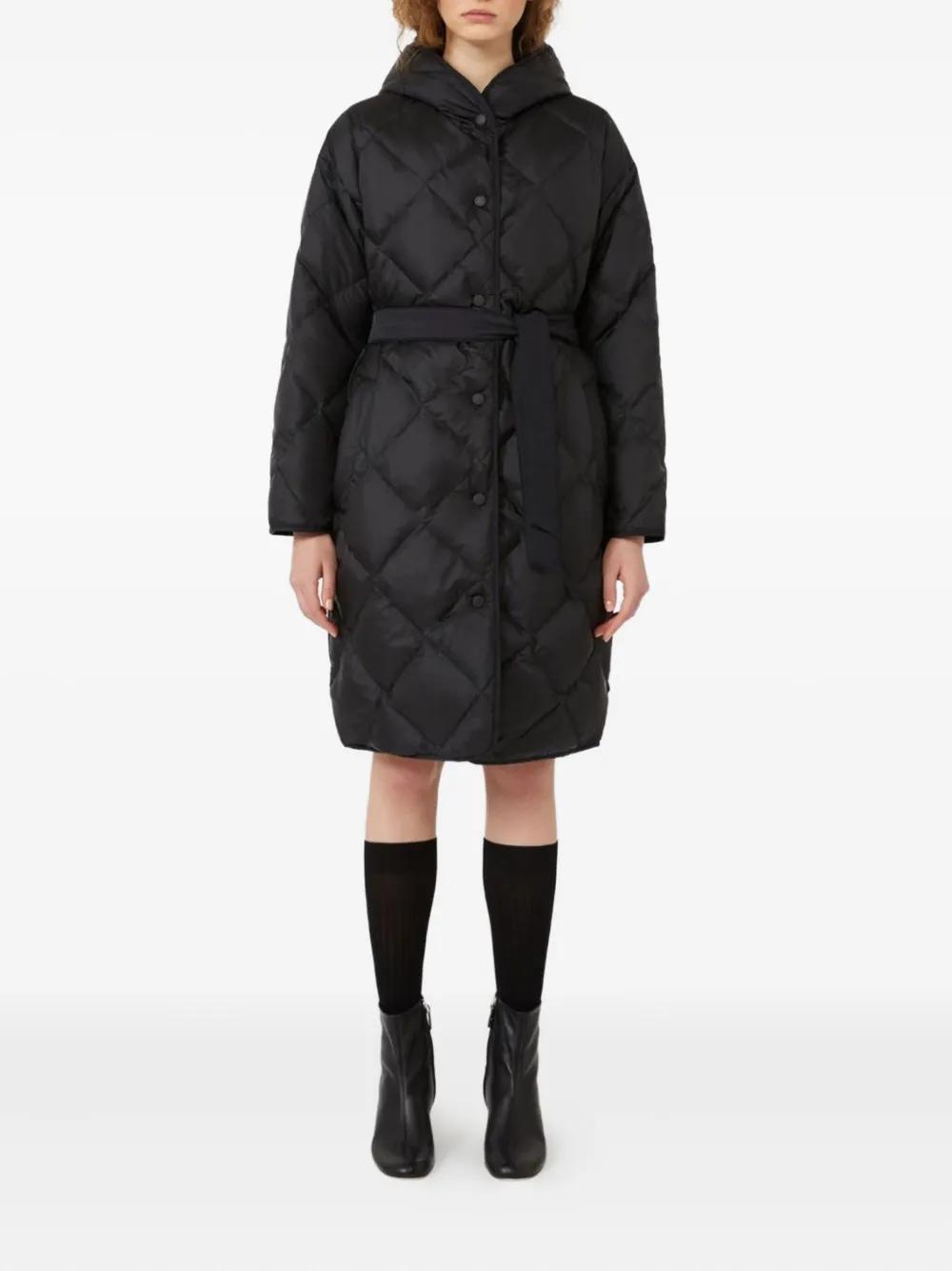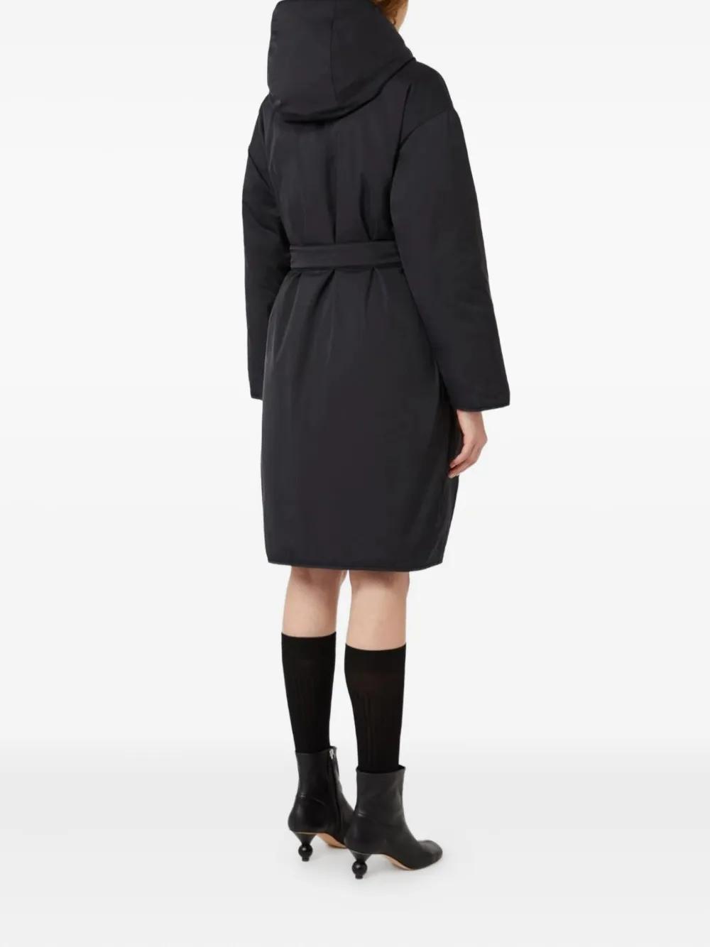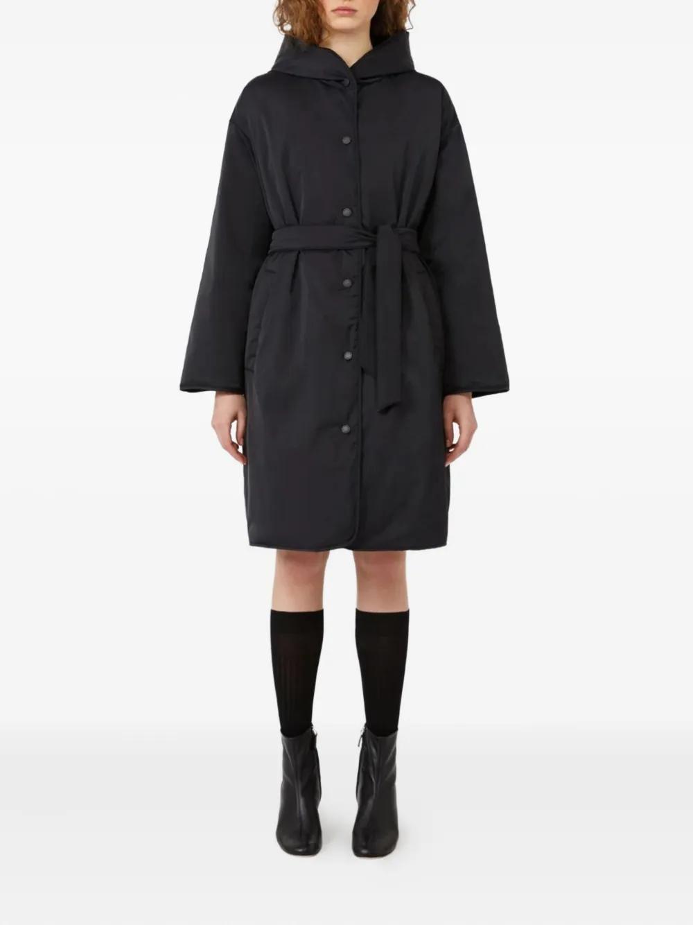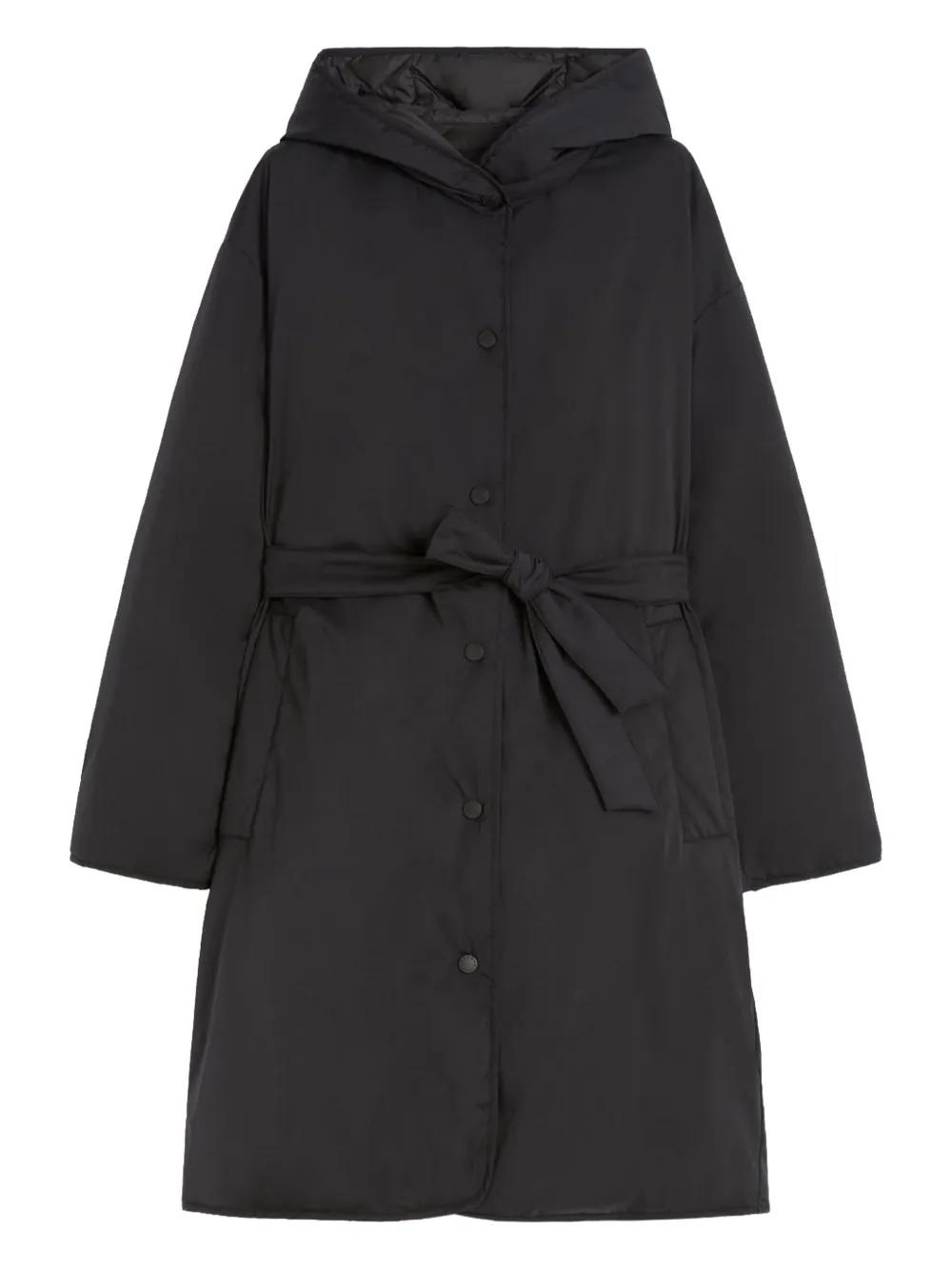 black hooded neckline button fastening belted waist long sleeves quilted design