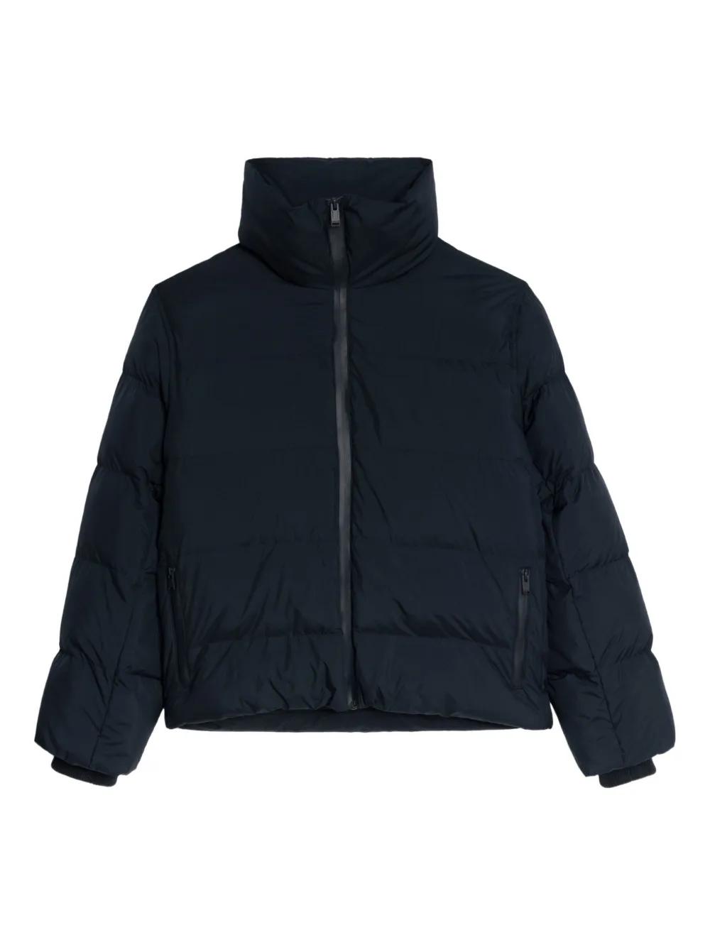 navy blue quilted design high collar zip fastening logo tape ribbed cuffs