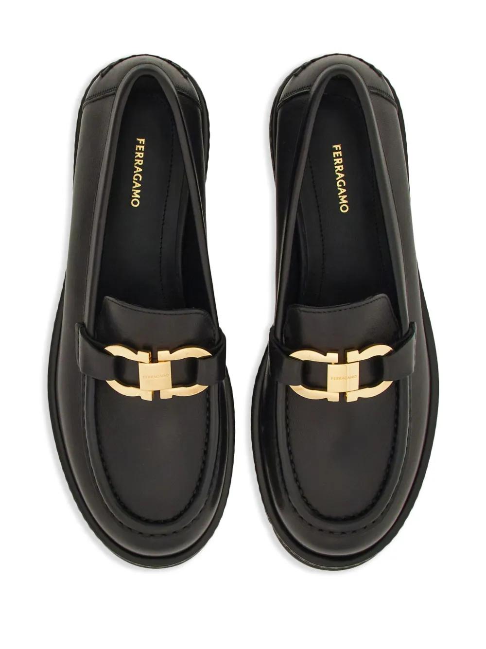 black calfskin tonal stitching gold-tone hardware Gancini plaque whipstitch detailing round toe slip-on style branded leather insole ridged rubber sole