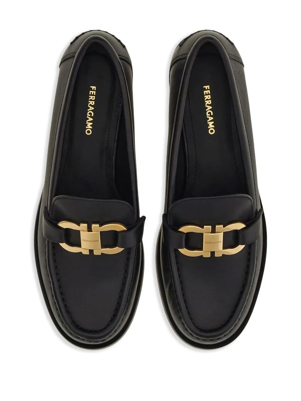 black calfskin Gancini plaque gold-tone hardware slip-on style round toe branded footbed low block heel rubber sole