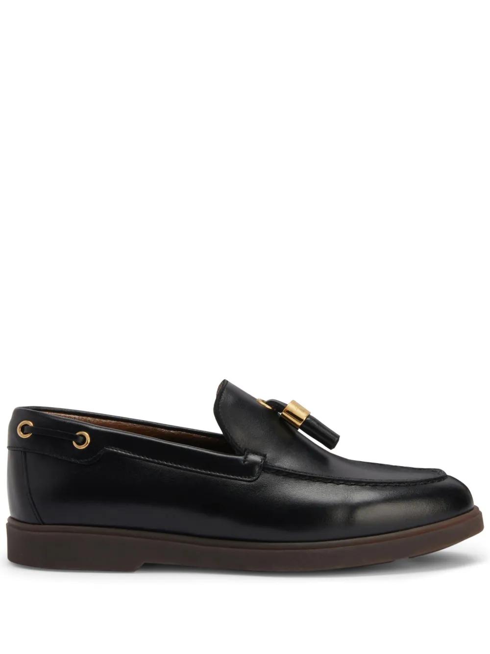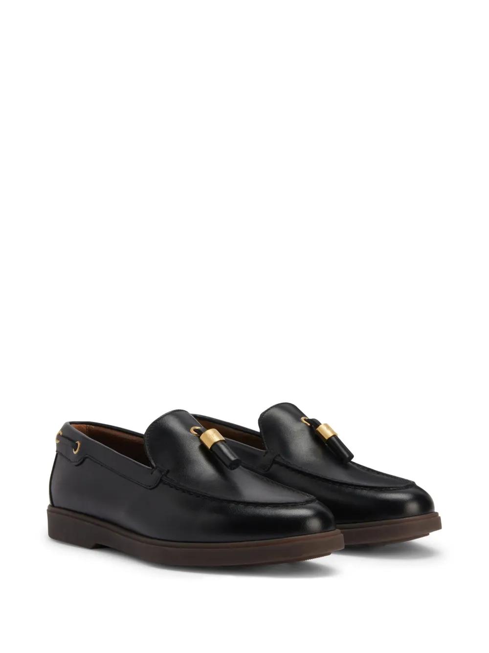 black leather tassel detail logo-engraved gold-tone hardware slip-on style almond toe branded leather insole flat rubber sole