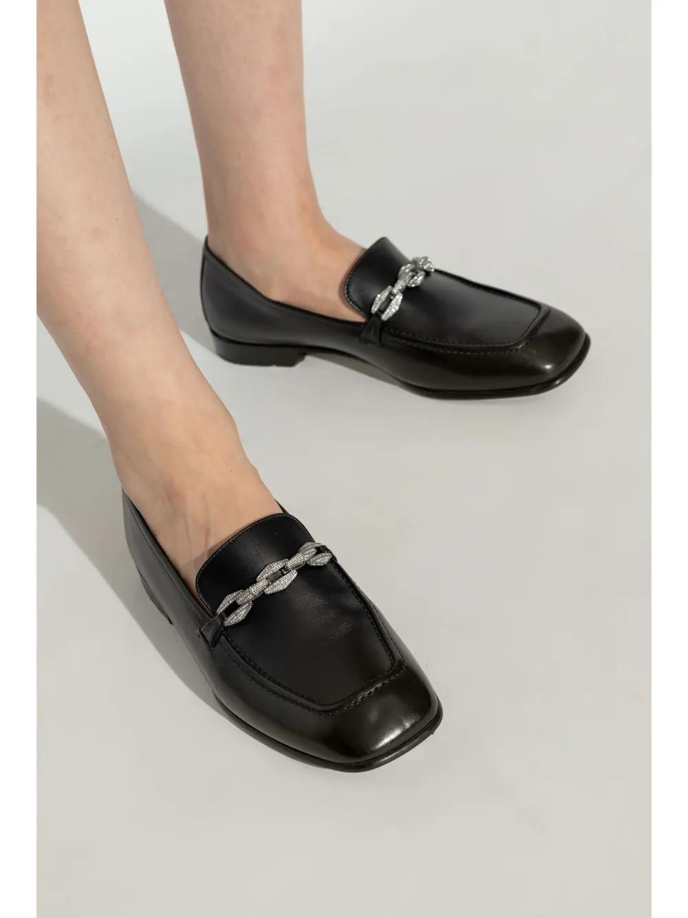 black calf leather chain-link detailing crystal embellishment square toe slip-on style branded leather insole rubber sole