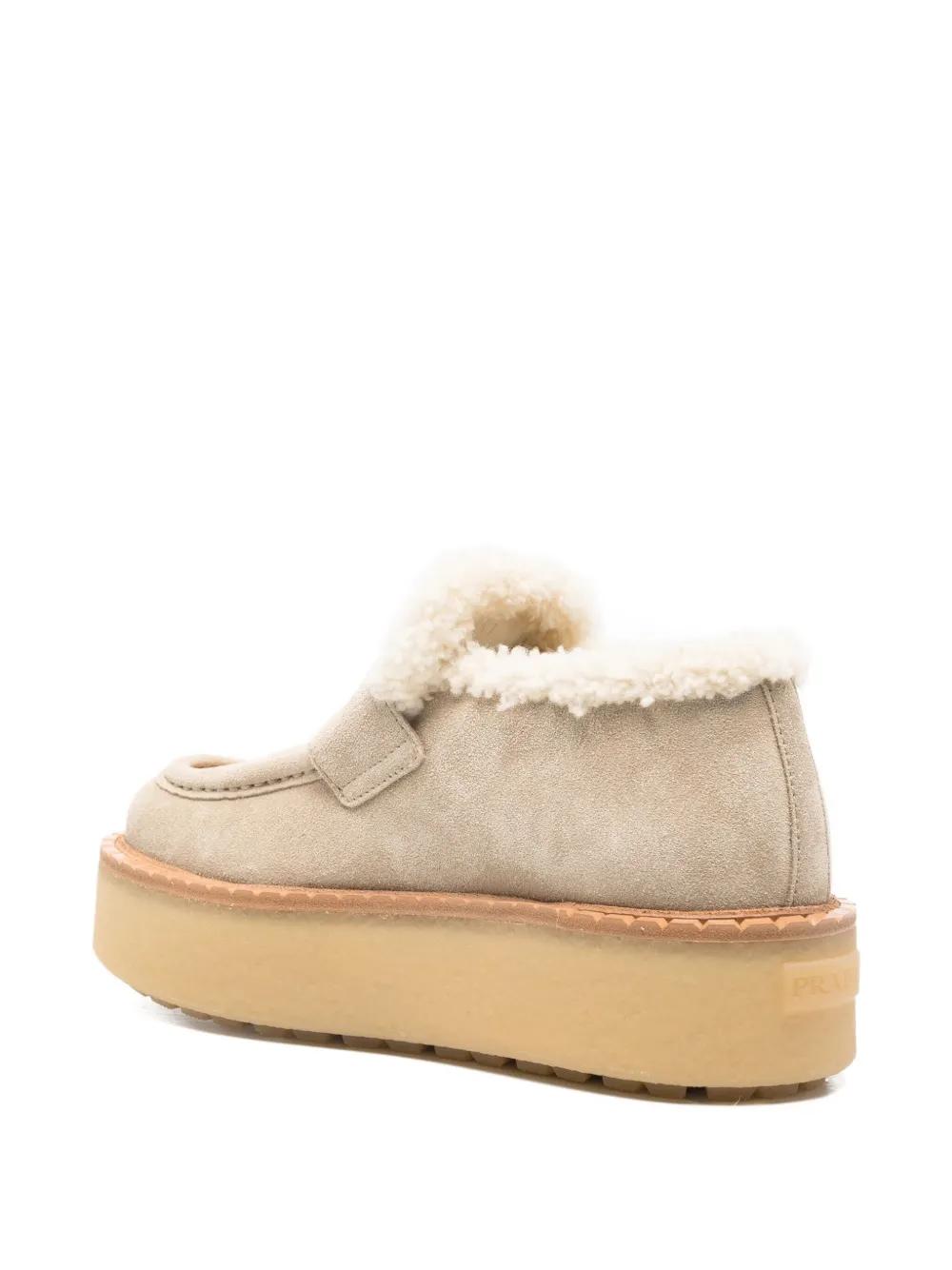 sand beige shearling trim platform sole gold-tone logo plaque slip-on style round toe