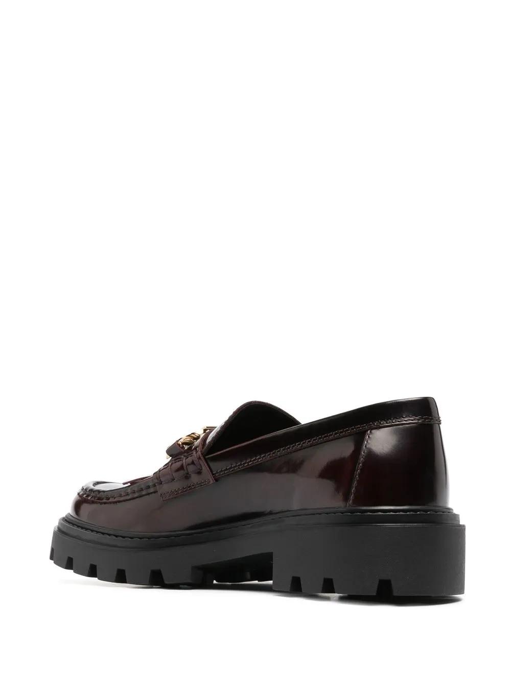 red calf leather gold-tone logo plaque fringe detailing slip-on style round toe ridged rubber sole branded insole