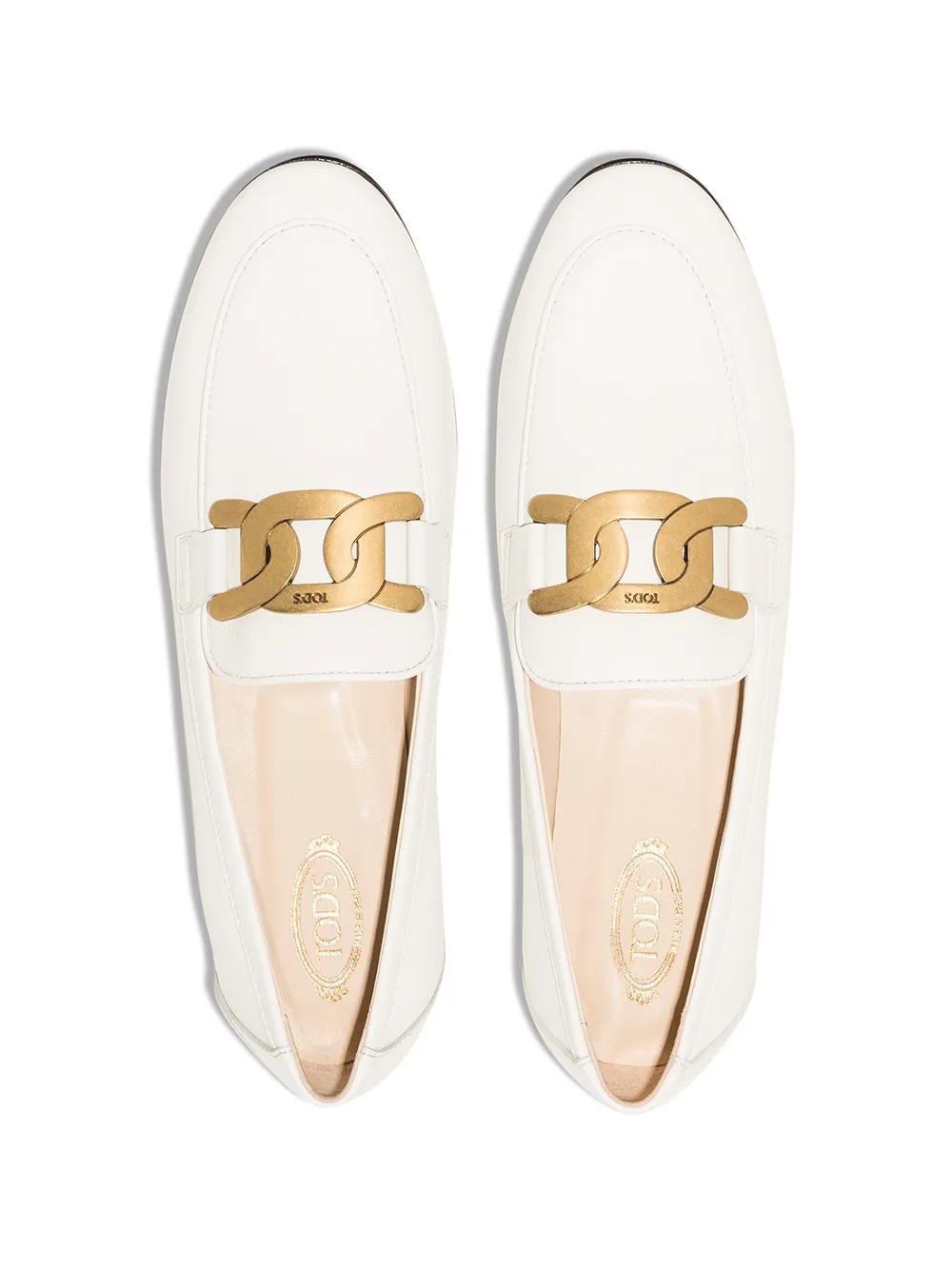 white/gold leather slip-on style round toe chain-link detailing gold-tone hardware branded leather insole flat leather sole