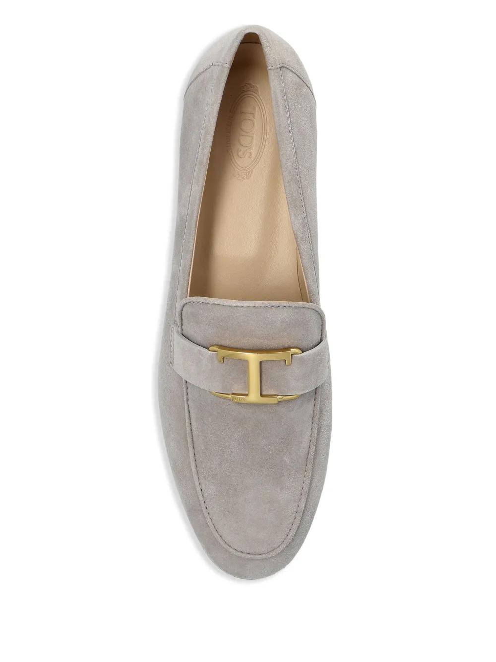 light grey flat sole round toe gold-tone hardware slip-on style