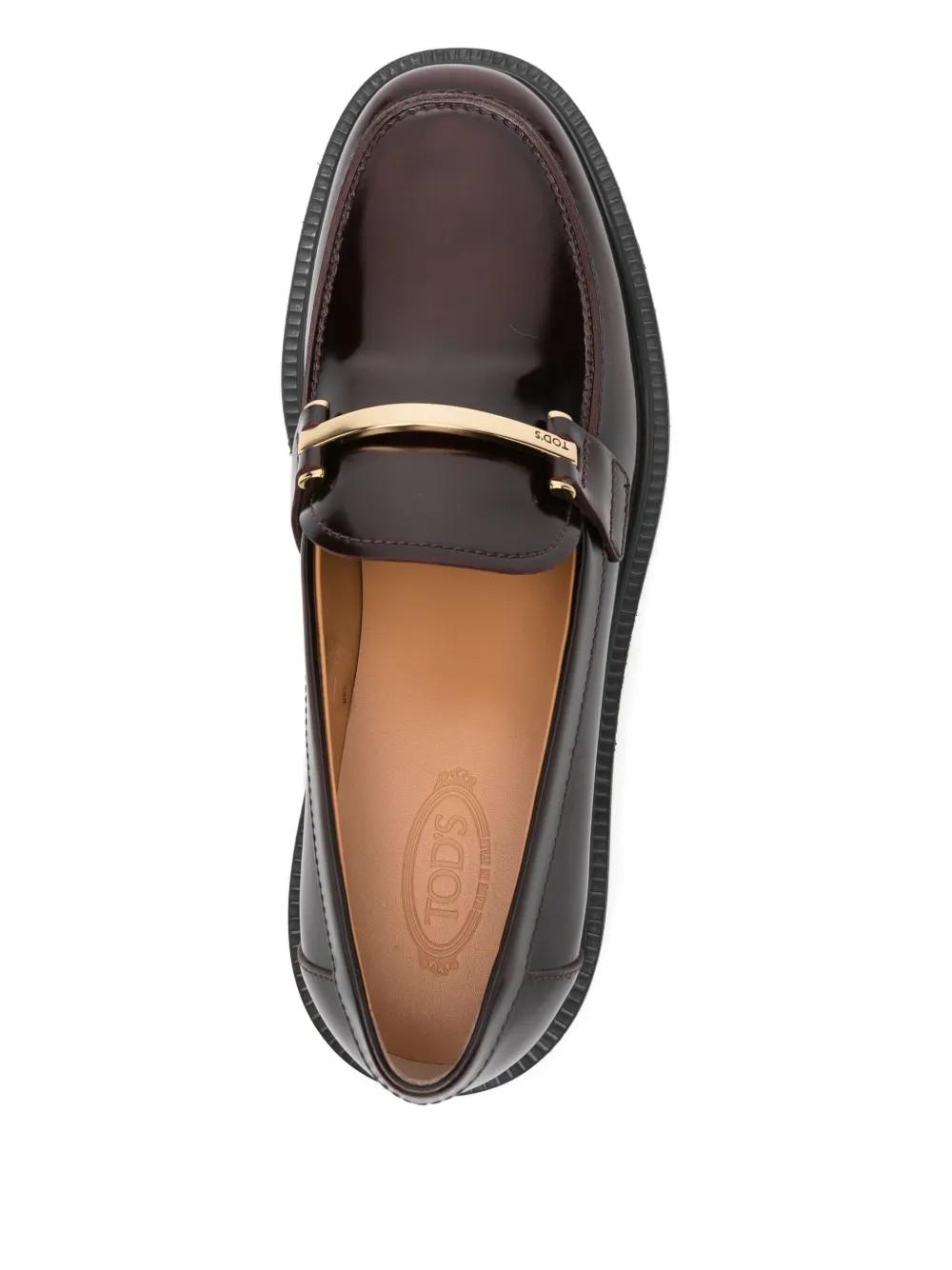 dark red leather upper gold-tone bar detail flat rubber-sole rounded toe slip-on style