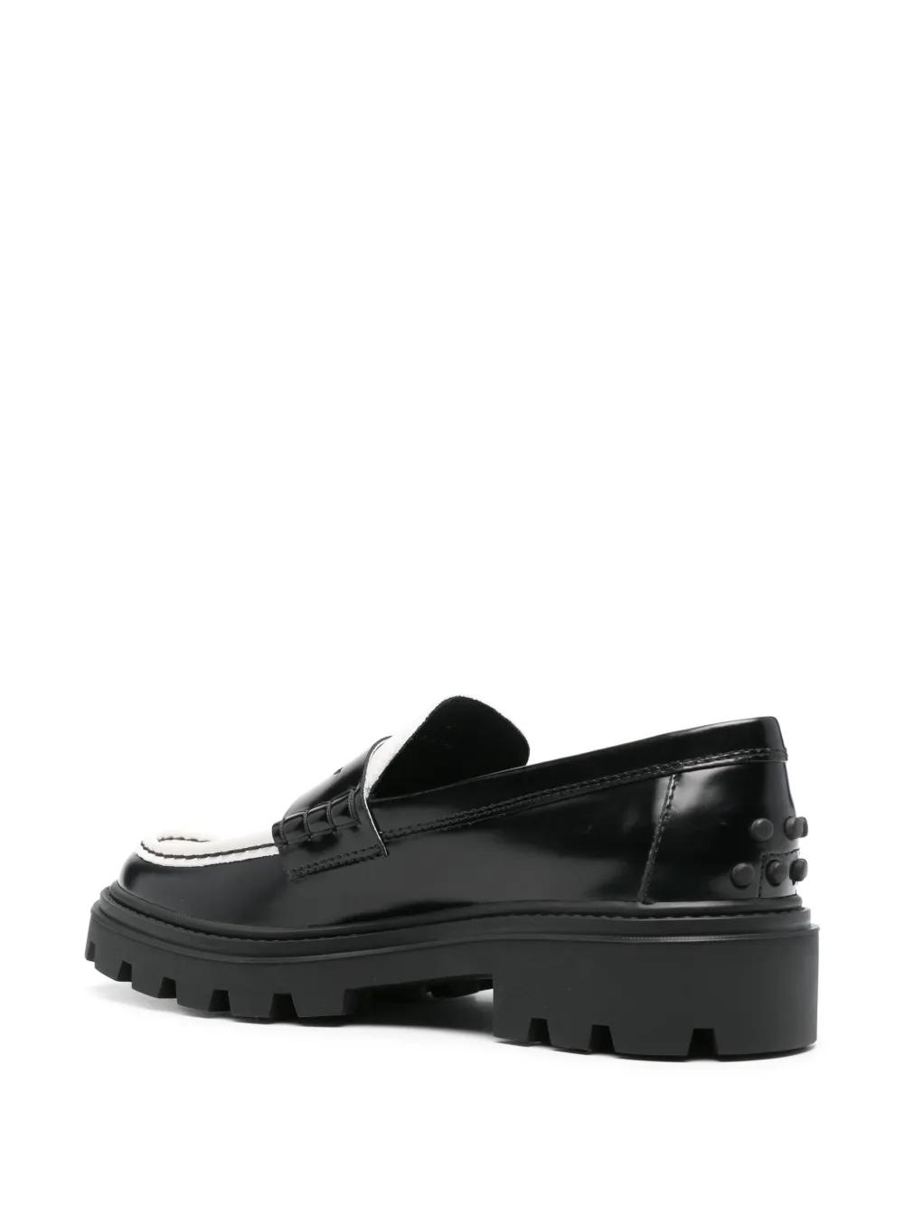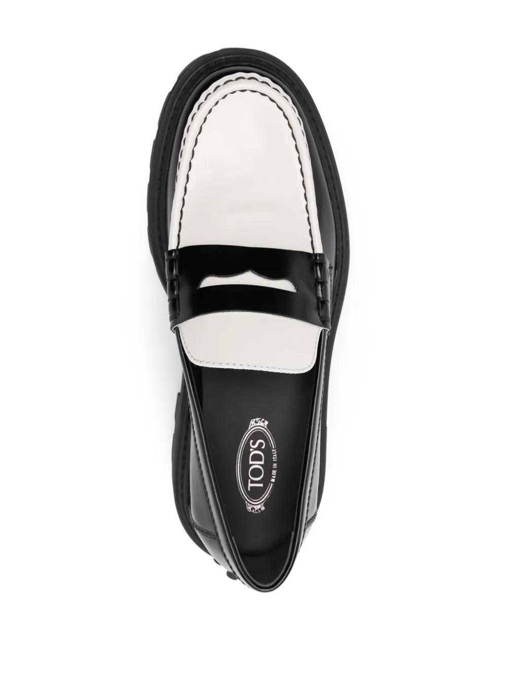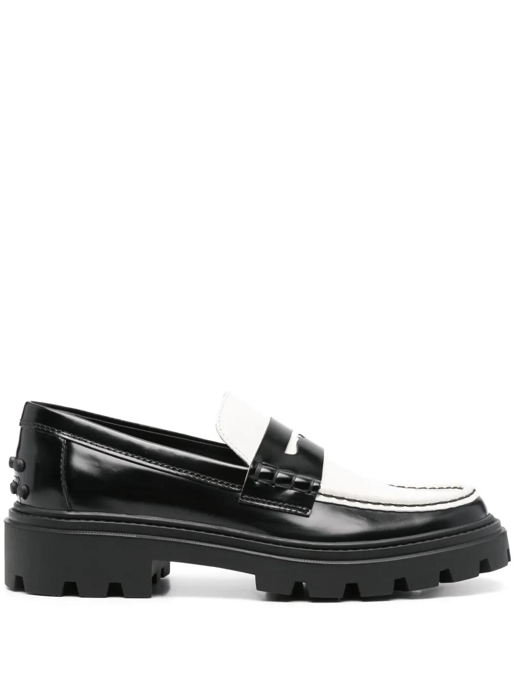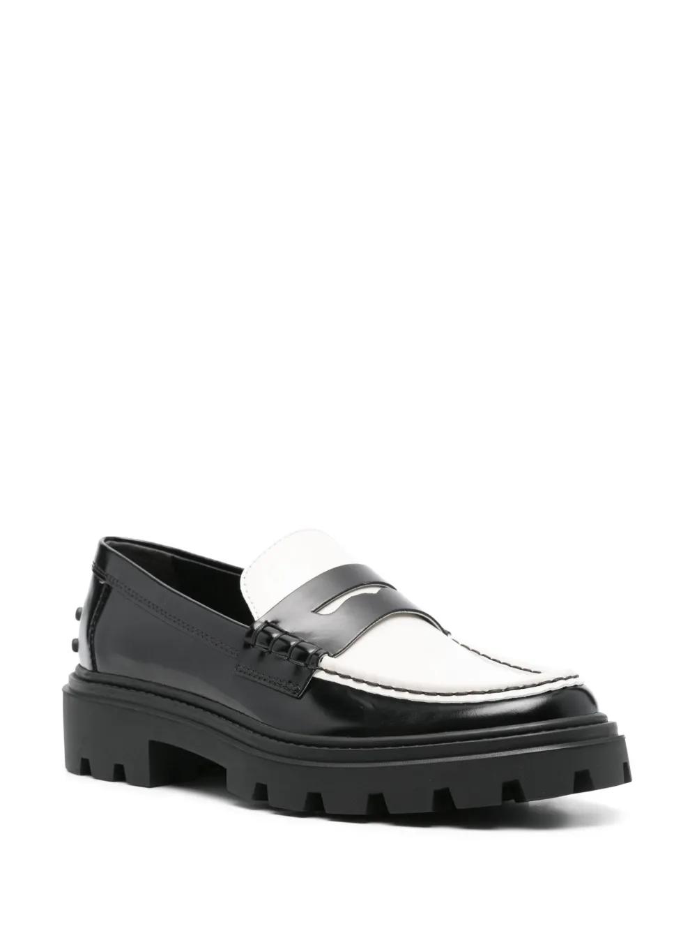 black/white calf leather two-tone design slip-on style debossed logo to the front penny slot moc stitching decorative stitching round toe branded leather insole leather lining rubber lug sole