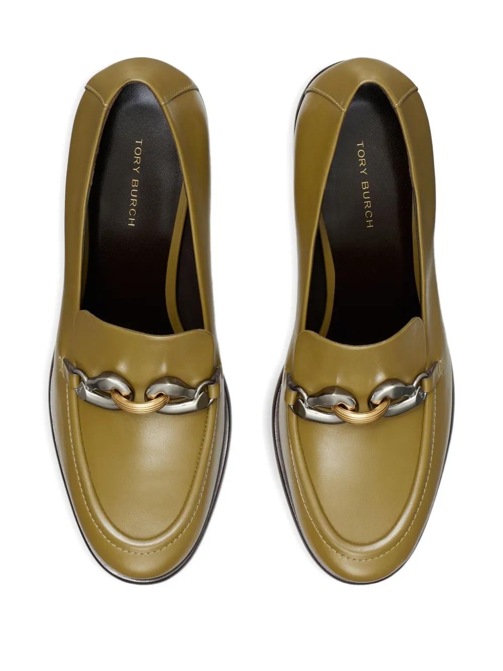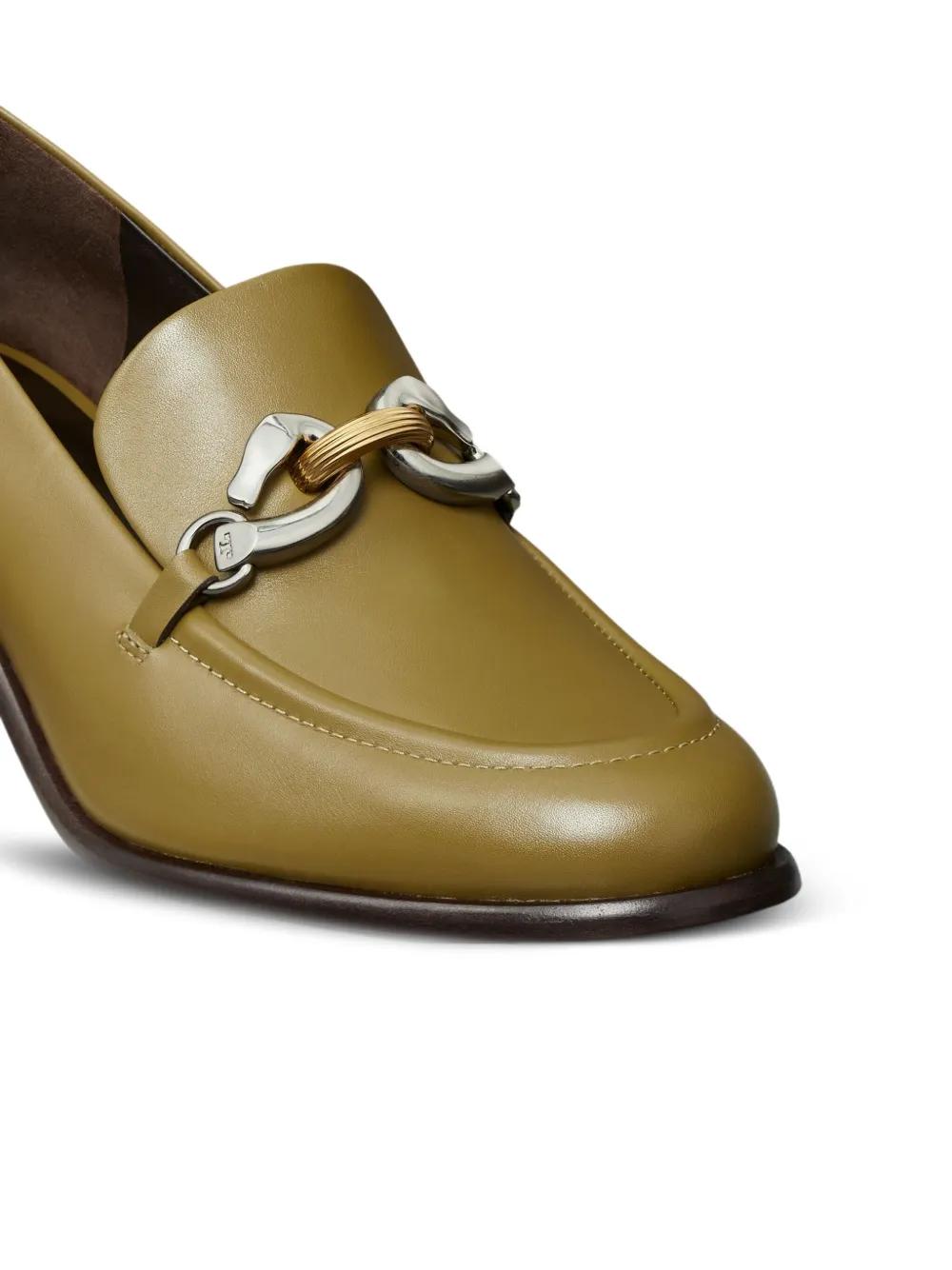 olive green calf-leather upper horsehead hardware block heel almond toe